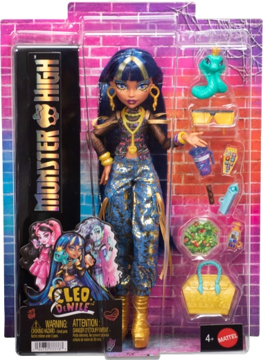 Wejdź do świata MONSTER HIGH z ikoniczną Cleo De Nile, która lśni w nowoczesnym egipskim stylu. Krótki top wiązany przy szyi, siateczkowe rękawy i niebieskie spodnie cargo ze złotymi akcentami podkreślają jej królewskie pochodzenie. W zestawie znajduje się także wierna kobra Sykfia, która idealnie dopełnia każdą upiornie stylową scenkę.