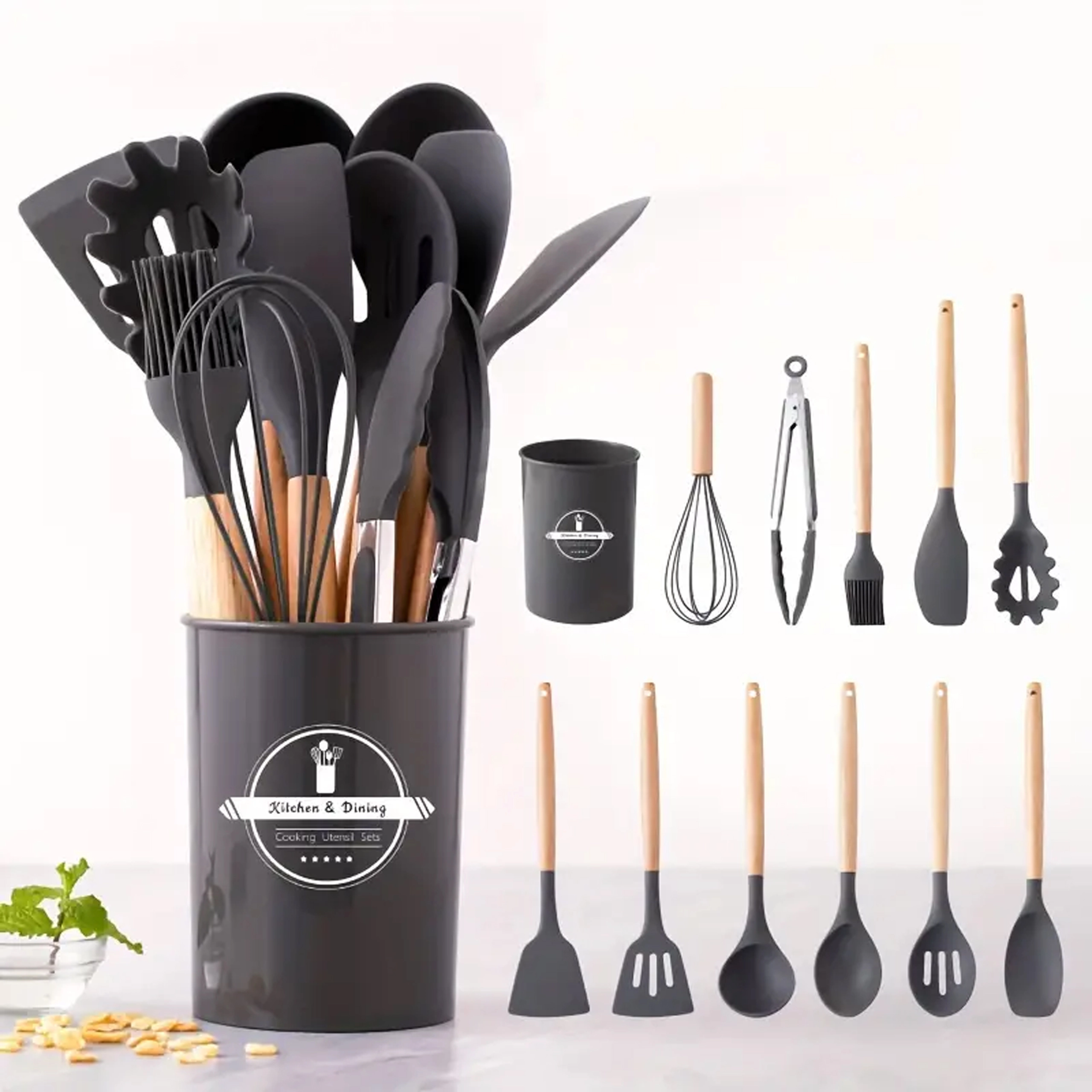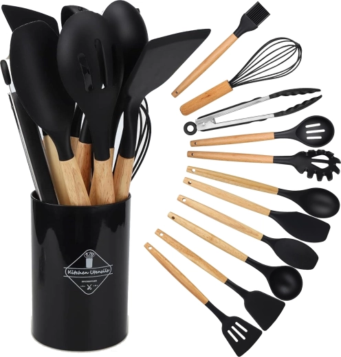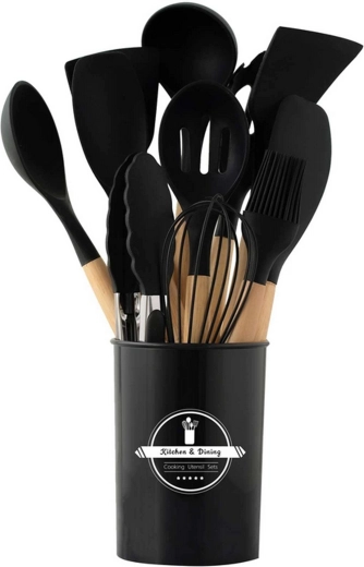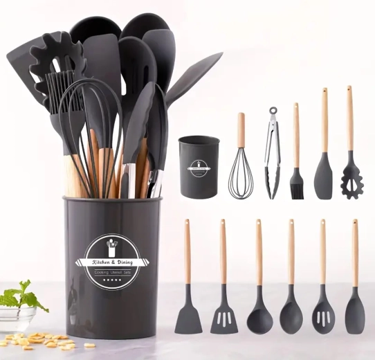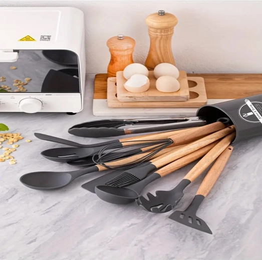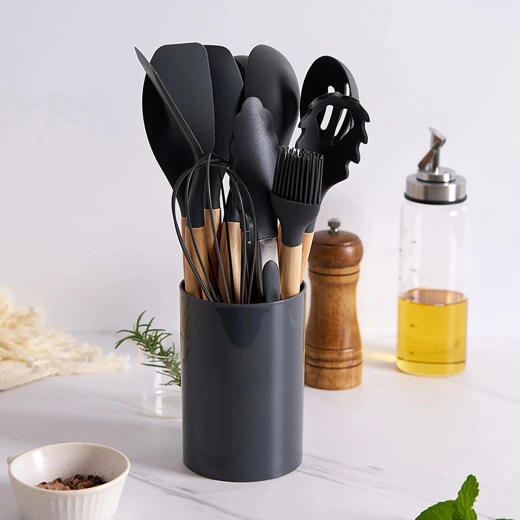 Praktyczny zestaw 12 silikonowych narzędzi z drewnianymi uchwytami do codziennego gotowania. Delikatne dla naczyń z powłoką nieprzywierającą, odporne na wysoką temperaturę, nie rysują powierzchni i oferują wygodne, ergonomiczne drewniane uchwyty. Idealne do mieszania, przewracania, serwowania i pieczenia – wszystko przejrzyście przechowasz w stojaku.