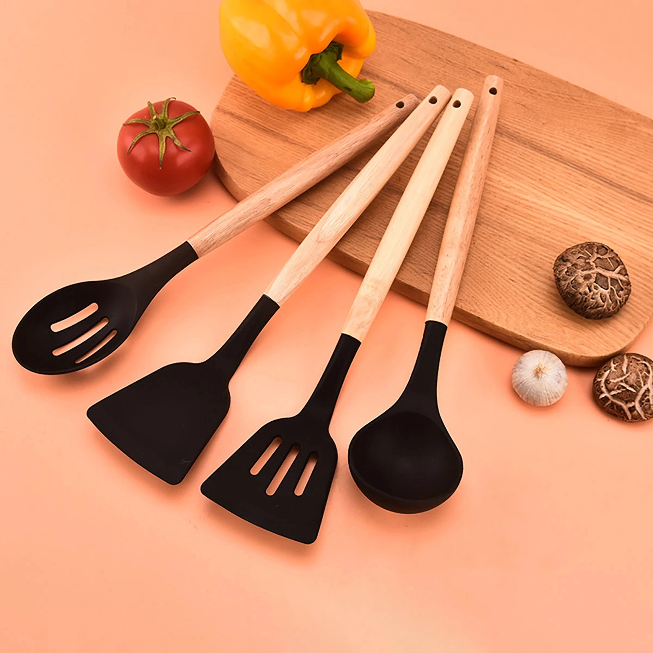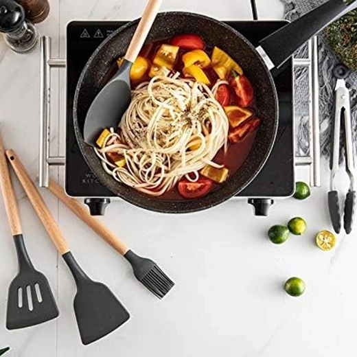 Ten wszechstronny zestaw narzędzi kuchennych łączy wytrzymały silikon z przyjemnym w dotyku naturalnym drewnem. Silikonowe końcówki są delikatne dla patelni z powłoką nieprzywierającą i łatwe w czyszczeniu, a drewno zapewnia pewny i wygodny chwyt. Zestaw obejmuje większość czynności podczas gotowania i pieczenia – od mieszania sosów po serwowanie makaronu.