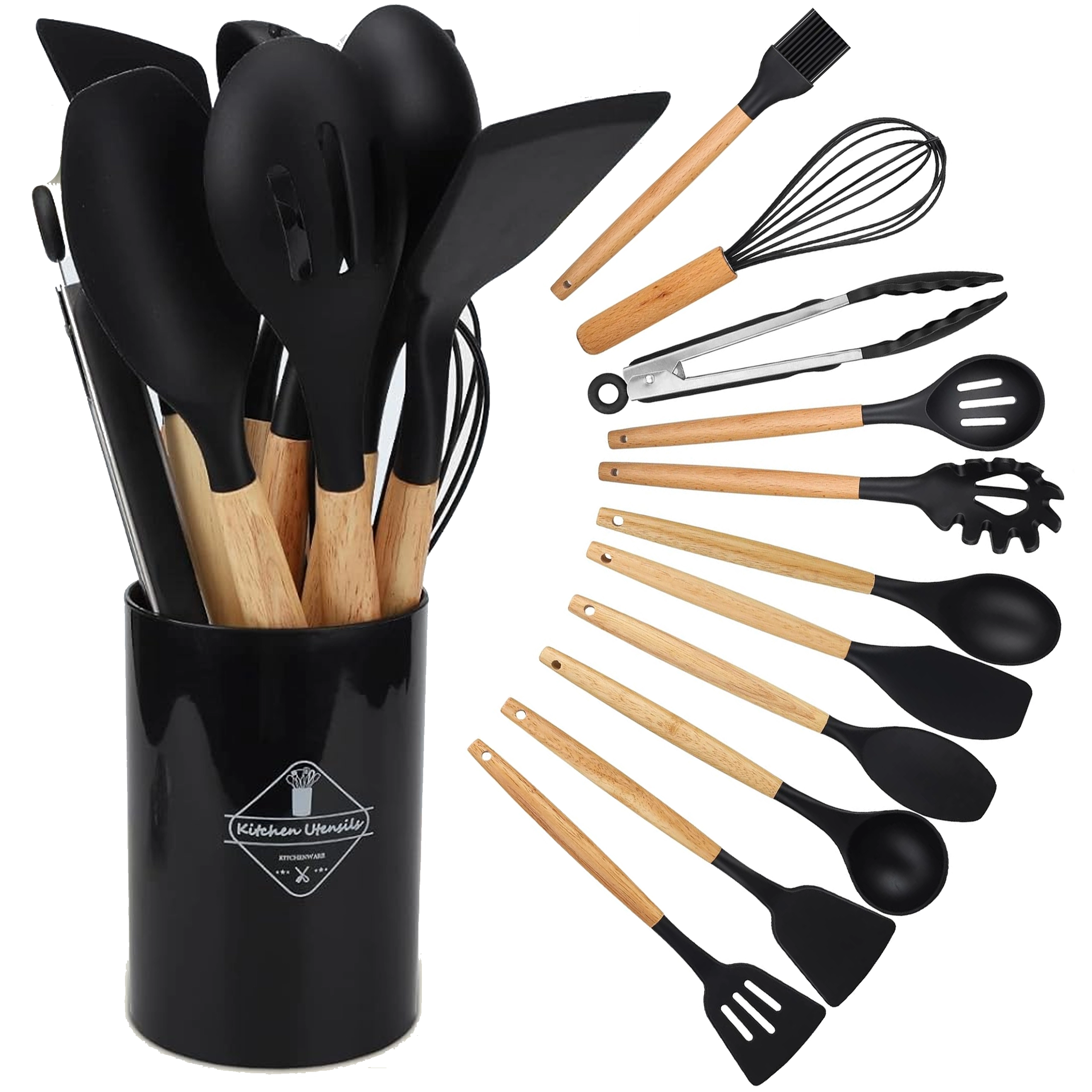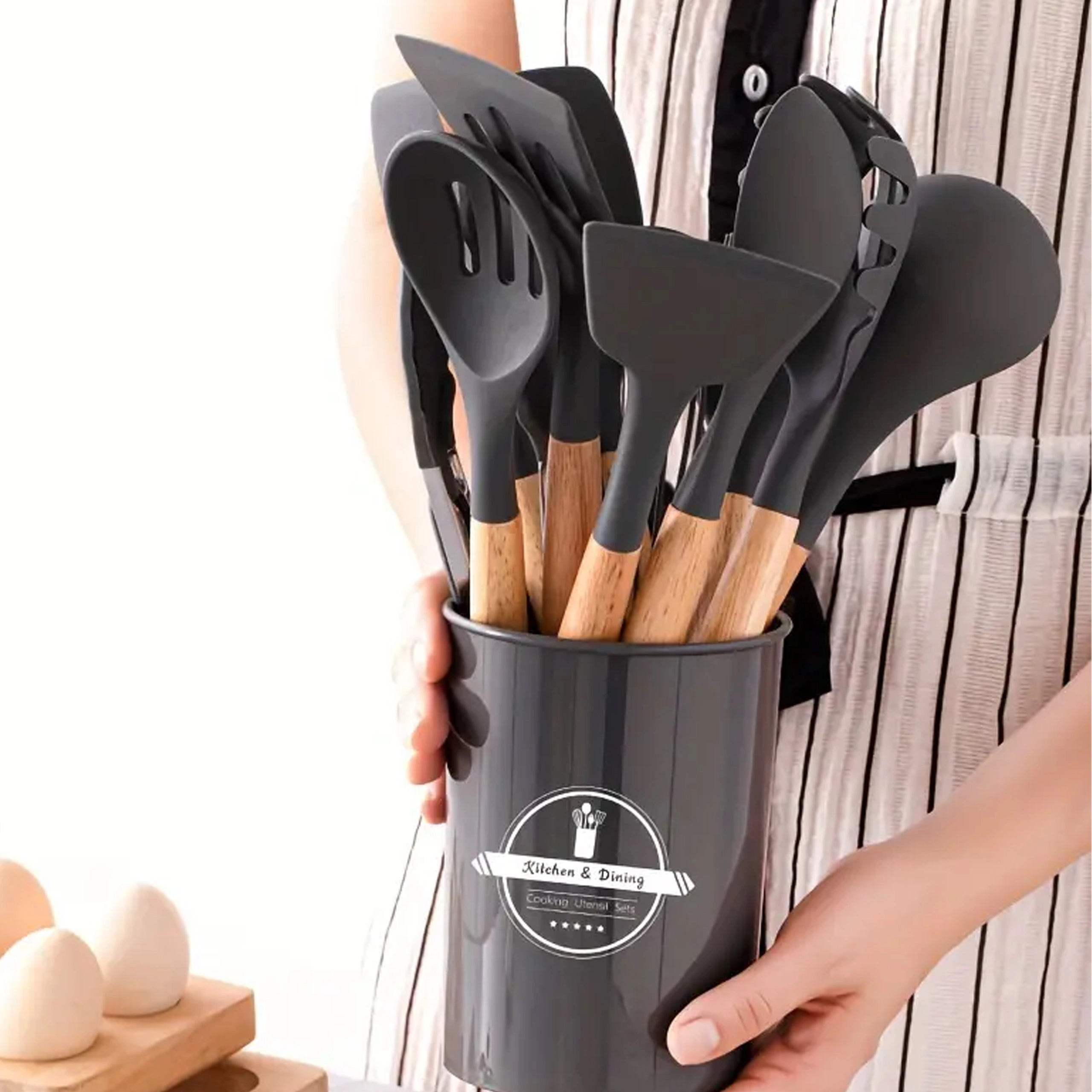 Zestaw zawiera szpatułki, łyżki, chochelkę, trzepaczkę, szczypce, pędzelek, łyżkę do makaronu i inne – wszystko przechowywane w stojaku dla szybkiego dostępu.