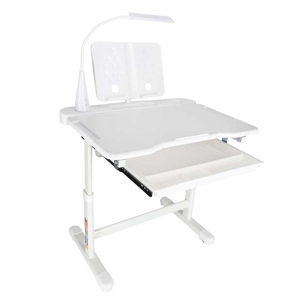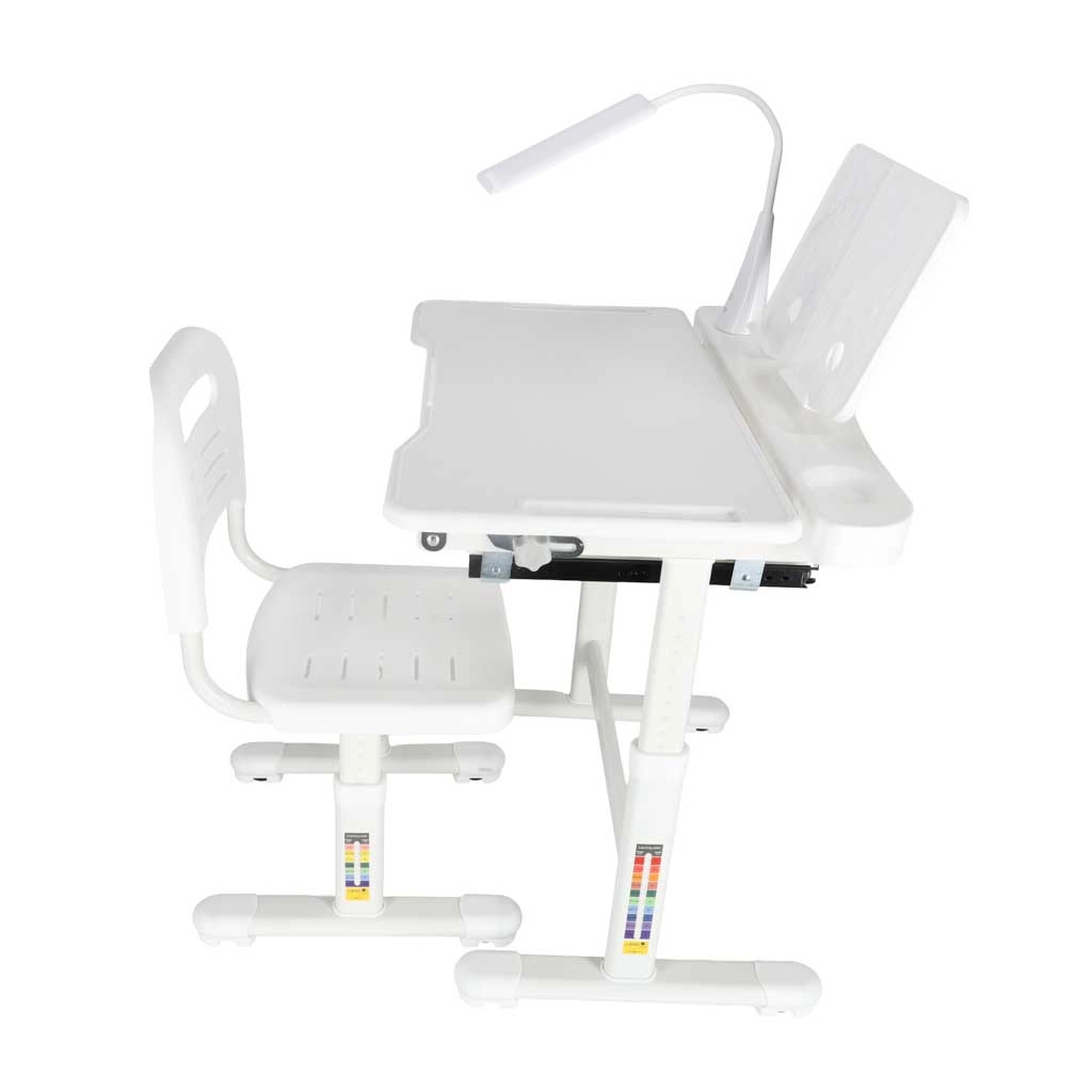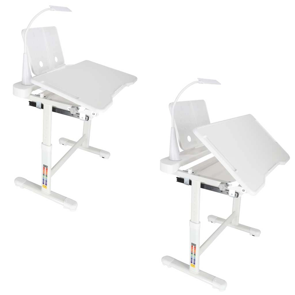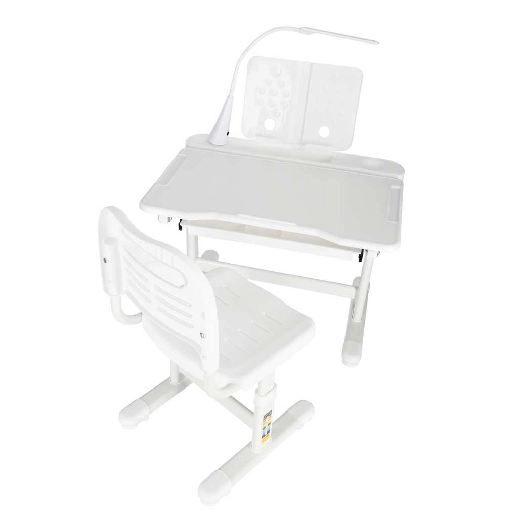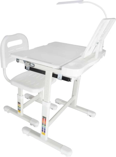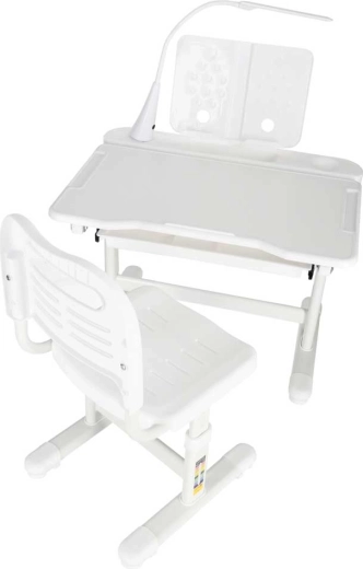 Ten nowoczesny dziecięcy zestaw rośnie wraz z Twoim dzieckiem: biurko z regulacją 53–71 cm i krzesło z regulowaną wysokością siedziska 28–40 cm łatwo dopasowują się do sylwetki i aktywności. Odchylany blat roboczy do 60° wspiera prawidłową ergonomię podczas pisania, czytania i rysowania, odciążając dziecięcy kręgosłup.