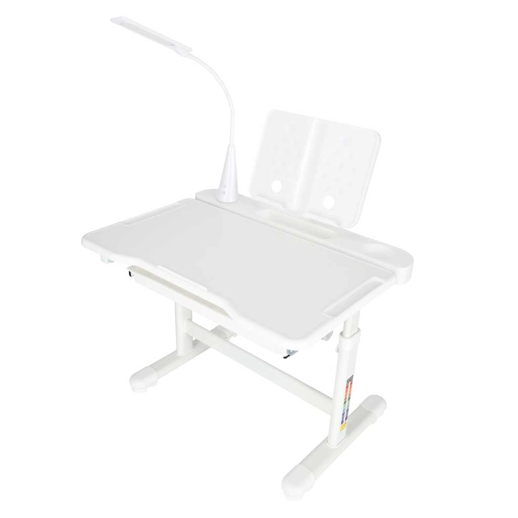 Zintegrowana lampka LED zasilana przez USB oferuje 3 barwy światła (ciepła, zimna, mieszana) oraz 3 poziomy jasności dla idealnego oświetlenia o każdej porze dnia. Szeroka, wysuwana szuflada z przegródkami oraz stojak na książkę/tablet utrzymują przybory w porządku i pod ręką. Bezpieczne zaokrąglone krawędzie oraz solidna konstrukcja ramowa z metalu, MDF i tworzywa zapewniają stabilność i długą żywotność.