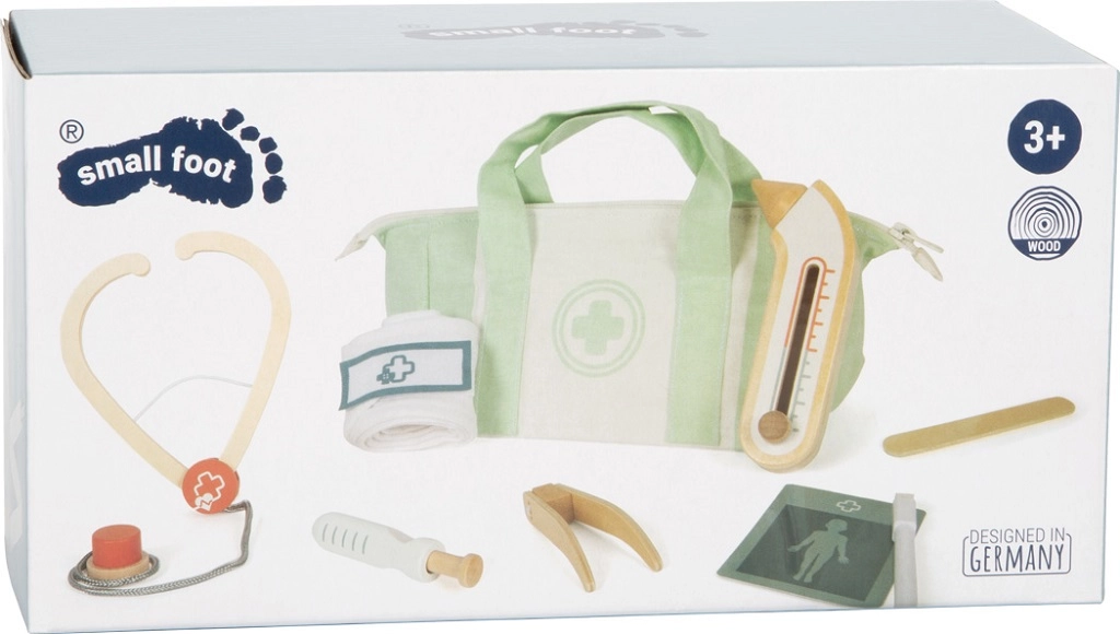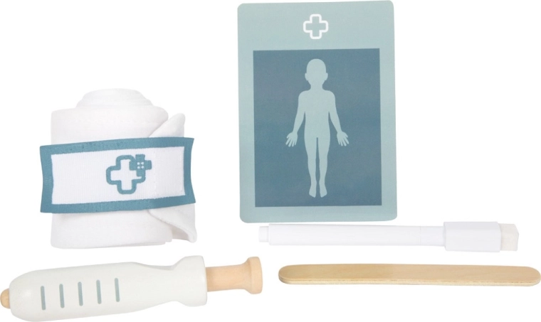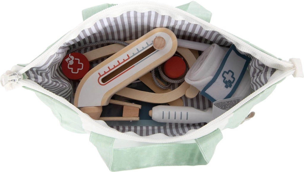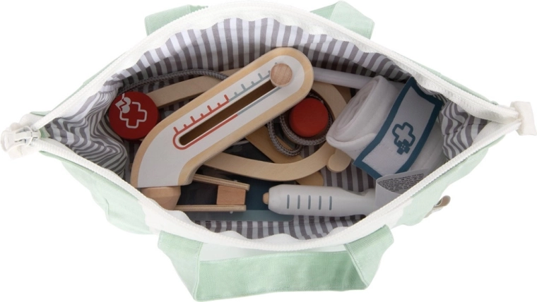 - stetoskop, strzykawka (wysuwana), termometr z regulowanym wskaźnikiem, pęseta, drewniana szpatułka, tekstylny bandaż na rzep, karty pacjenta z pisakiem, torba lekarska