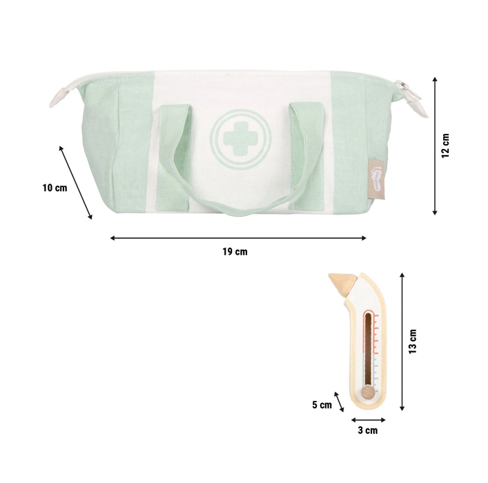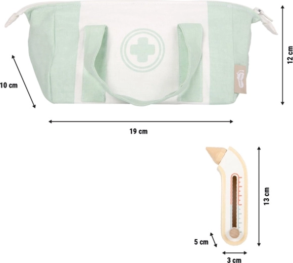 Dziecięcy zestaw lekarski w miętowo-białej torbie łączy trwałe drewniane narzędzia i miękkie tekstylne dodatki dla bezpiecznej i wartościowej zabawy. Dzięki realistycznym elementom – od słuchania serca, przez mierzenie temperatury, po „podanie” zastrzyku – dzieci ćwiczą empatię i komunikację, a jednocześnie oswajają lęk przed wizytą u lekarza.