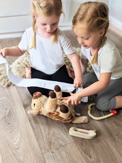 Praktyczna torba na zamek trzyma wszystko w jednym miejscu i łatwo się przenosi. Regulowany termometr i wysuwana strzykawka zachęcają do odkrywania i wspierają koordynację ręka–oko. Zmazywalne karty pacjenta z pisakiem rozwijają wyobraźnię i pierwsze kroki w logicznym myśleniu.