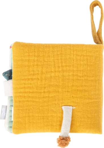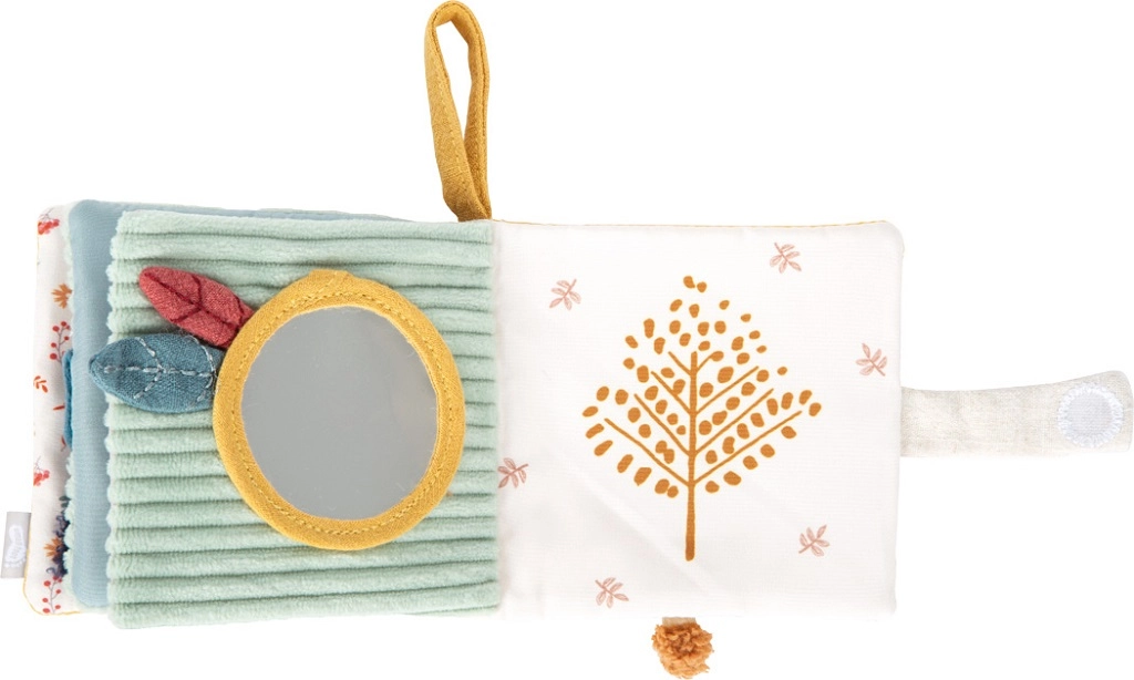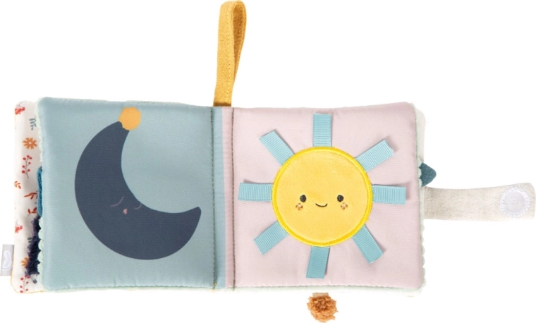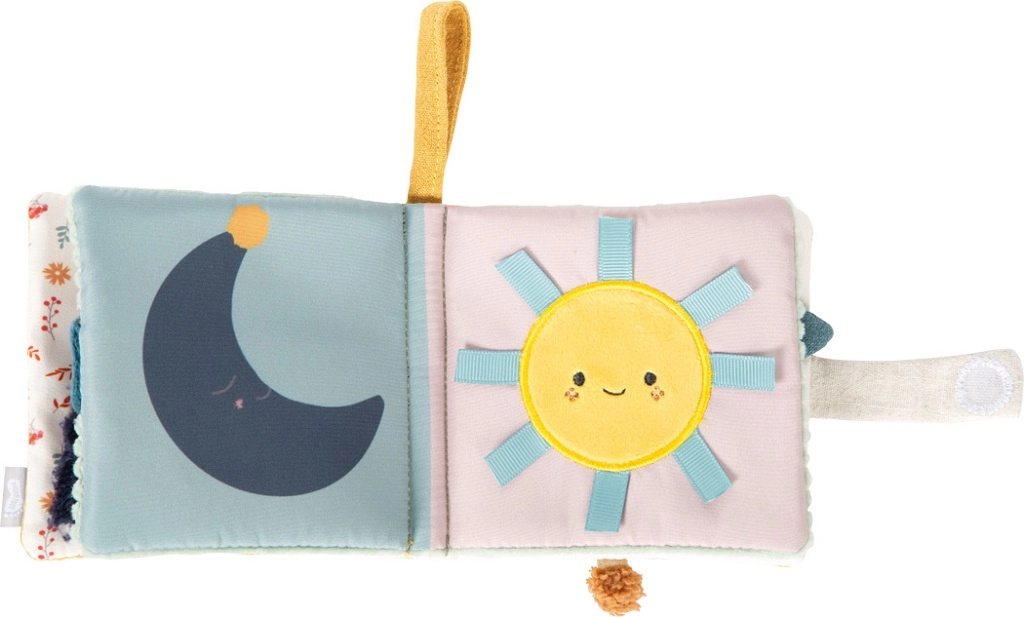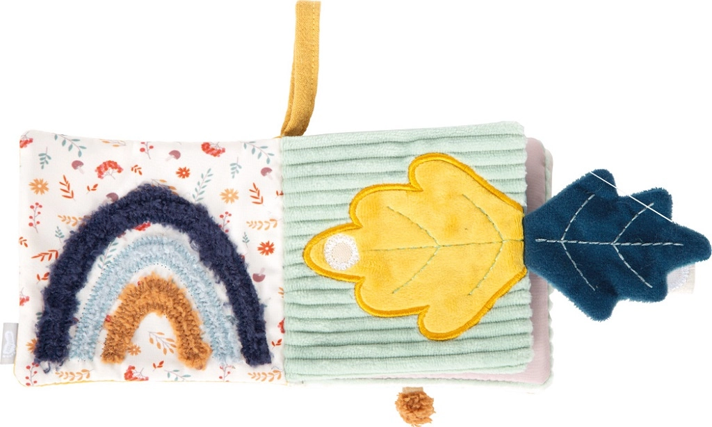 Każda strona oferuje inne wrażenia – szeleszczące panele, materiałowe zakładki, miękkie pluszowe elementy oraz zintegrowaną grzechotkę dla bodźców dźwiękowych.