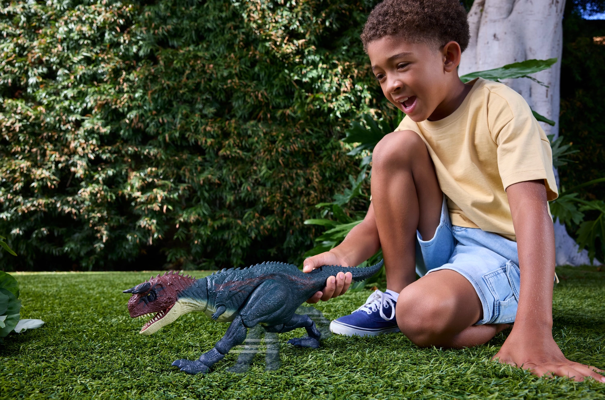 Odkryj pełną akcji zabawę z dinozaurami dzięki figurce Jurassic World Carnotaurus o wysokości ok. 20 cm. Oferuje interaktywny ruch, ryczące dźwięki, otwierane szczęki i szczegółowy, filmowy wygląd. Po naciśnięciu przycisku przy ogonie uruchamia się realistyczny bieg z poruszającymi się nogami oraz akcja „gryzienia”, które pobudzają wyobraźnię i dynamiczne opowieści.