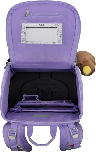 Przemyślane wnętrze z odchylanym otwieraniem umożliwia wygodny dostęp do podręczników prosto z ławki, wewnętrzna gumka do stabilizacji zawartości trzyma cięższe zeszyty przy plecach. Boczne kieszenie z wytrzymałego materiału nadają się na butelkę, wysokiej jakości zamki YKK gwarantują długą żywotność i płynną pracę. Zabawne wymienne naszywki podkreślą indywidualny styl małego ucznia.