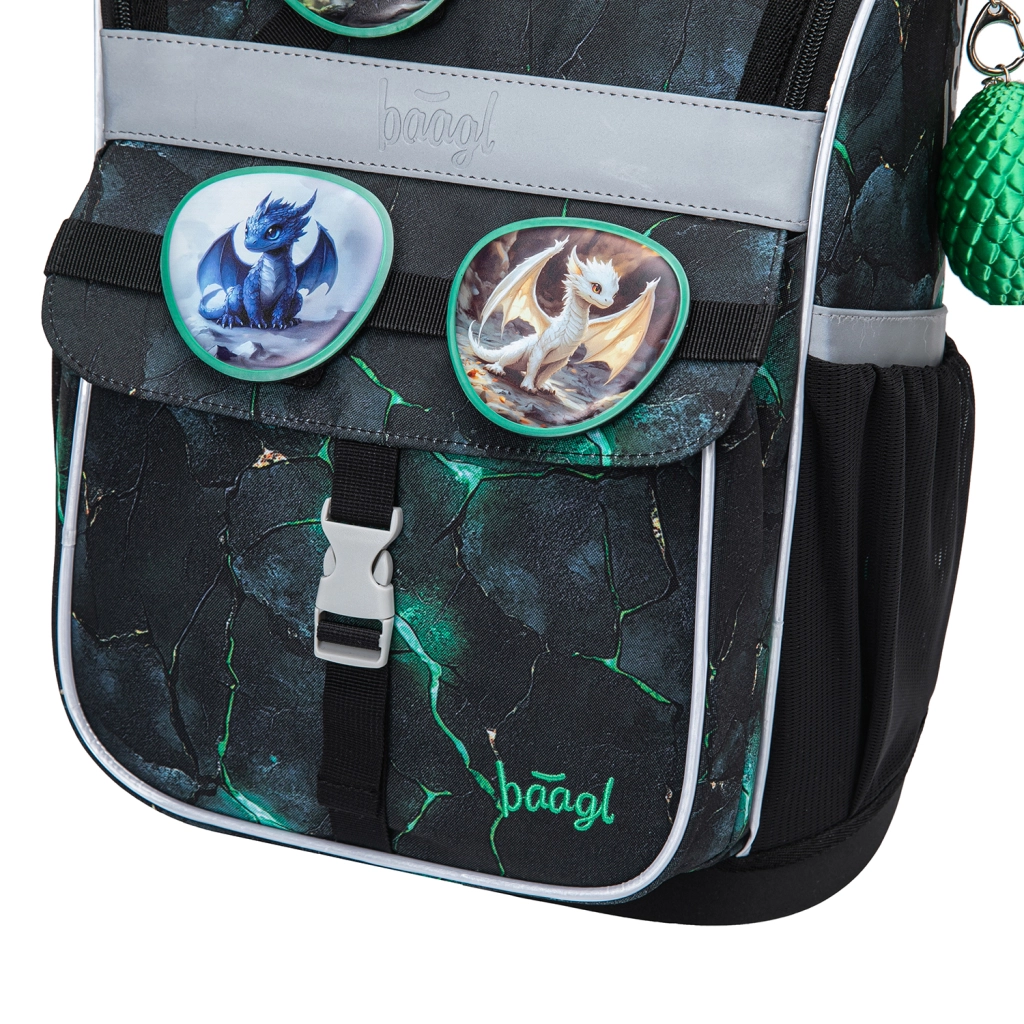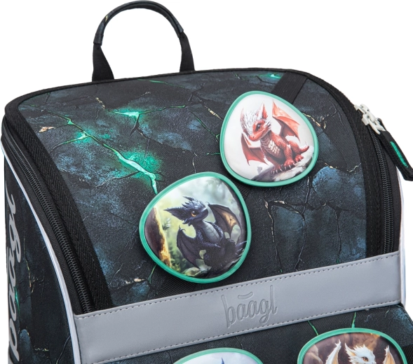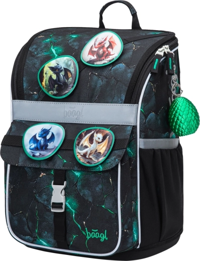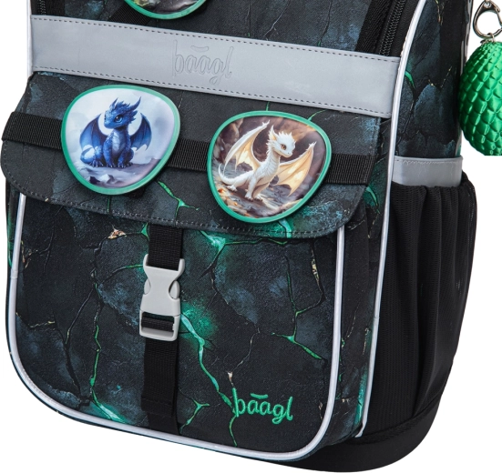 Elementy odblaskowe dla lepszej widoczności, wodoodporny materiał i niezawodne zamki YKK. Wymienne przypinki i smoczy motyw nadają aktówce niepowtarzalny wygląd.