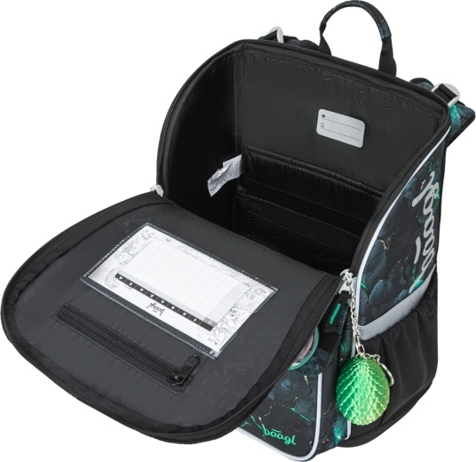 Wnętrze jest praktycznie zorganizowane: gumka do stabilizacji podręczników i zeszytów bliżej środka ciężkości ciała. Odchylany system otwierania umożliwia łatwy dostęp do przyborów prosto z ławki, a boczne kieszenie z wytrzymałego materiału pomieszczą także butelkę na napój. Nie brakuje bezpiecznych elementów odblaskowych dla dobrej widoczności, niezawodnych zamków YKK oraz sztywnego dna, dzięki któremu aktówka stabilnie stoi.