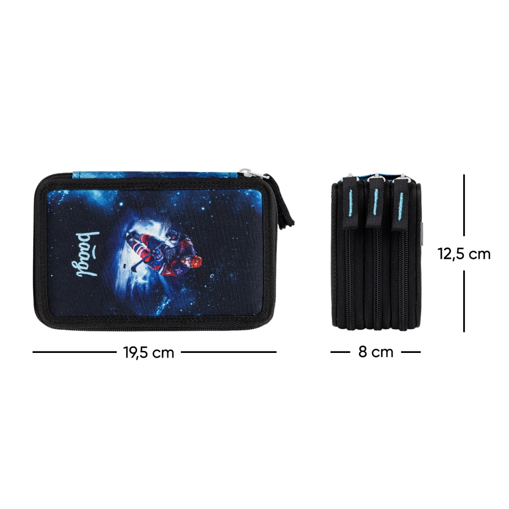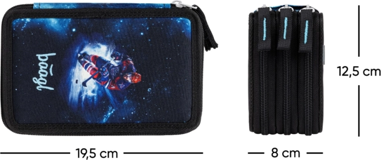 Piórnik oferuje trzy oddzielne sekcje na zamek, które ułatwiają organizację przyborów do pisania, linijek, gumek i drobnych dodatków. Wzmocniony grzbiet poprawia wygodę przy zamykaniu i otwieraniu, dzięki czemu piórnik komfortowo się użytkuje nawet w pełni wypełniony.