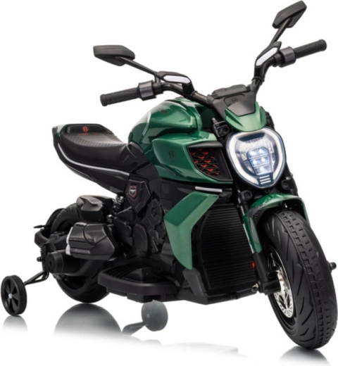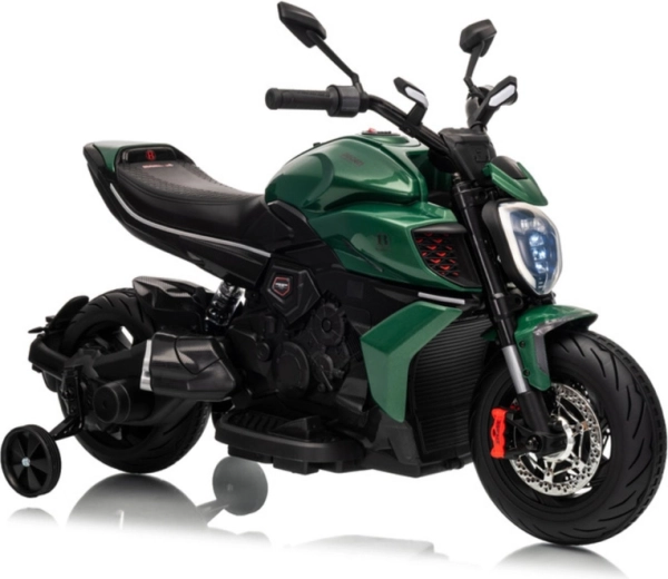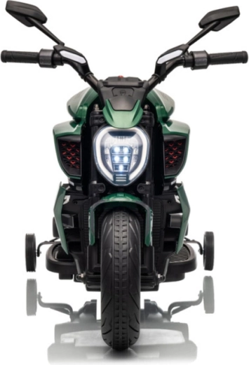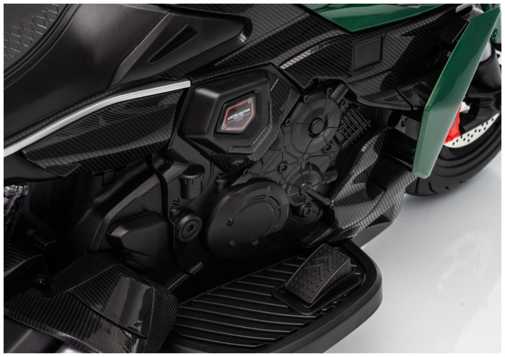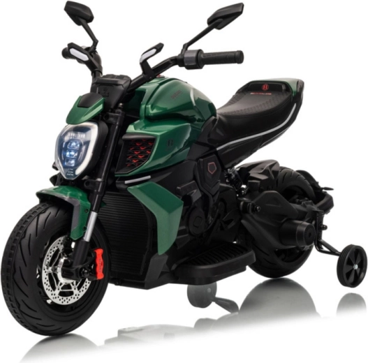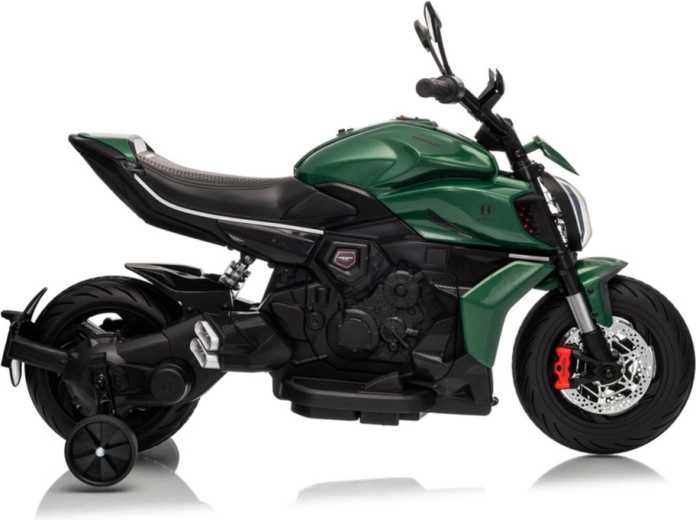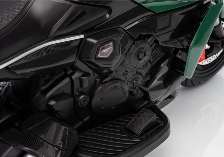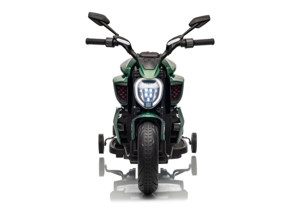 Dziecięcy motocykl elektryczny w zielonym kolorze zachwyca sportowym wyglądem i bezpieczną konstrukcją. Dzięki szerokim oponom i bocznym kółkom stabilizującym dzieci szybko czują się pewnie, a jasny reflektor LED i realistyczne detale (lusterka, tarczowe hamulce w wyglądzie) potęgują prawdziwe motocyklowe wrażenia.