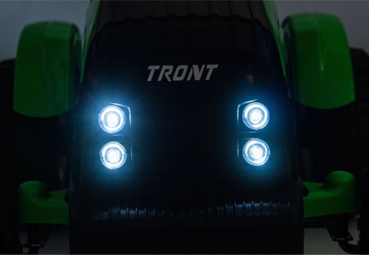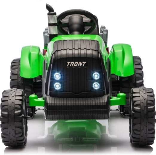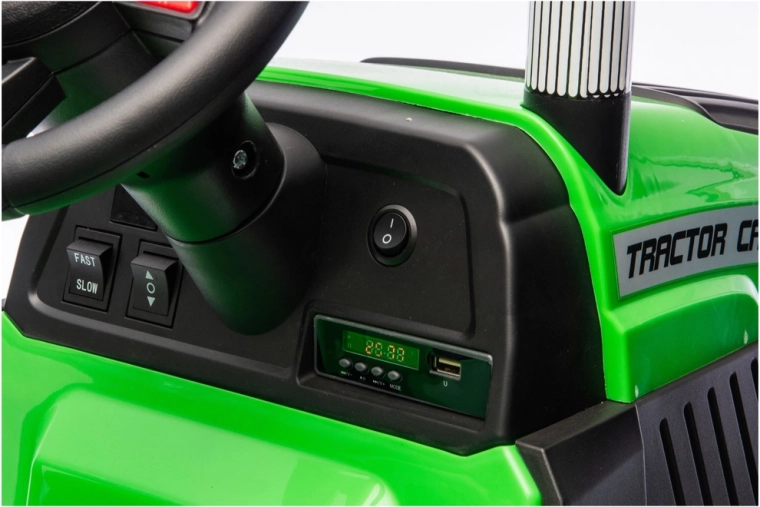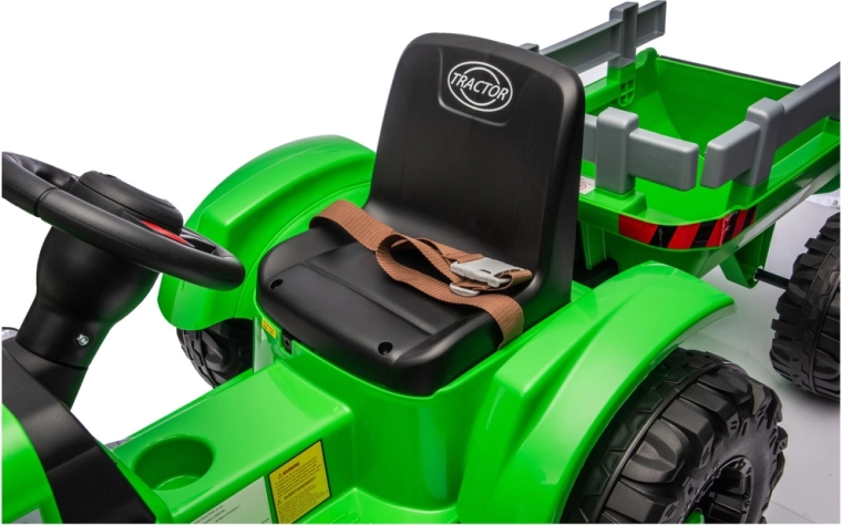 Traktor zaprojektowano z myślą o wygodnym i bezpiecznym użytkowaniu: ma ergonomiczną kierownicę, siedzisko z oparciem i pasem bezpieczeństwa oraz czytelne elementy sterujące. Przednie światła i realistyczne detale podkreślają atrakcyjny wygląd i wspierają kreatywną zabawę.