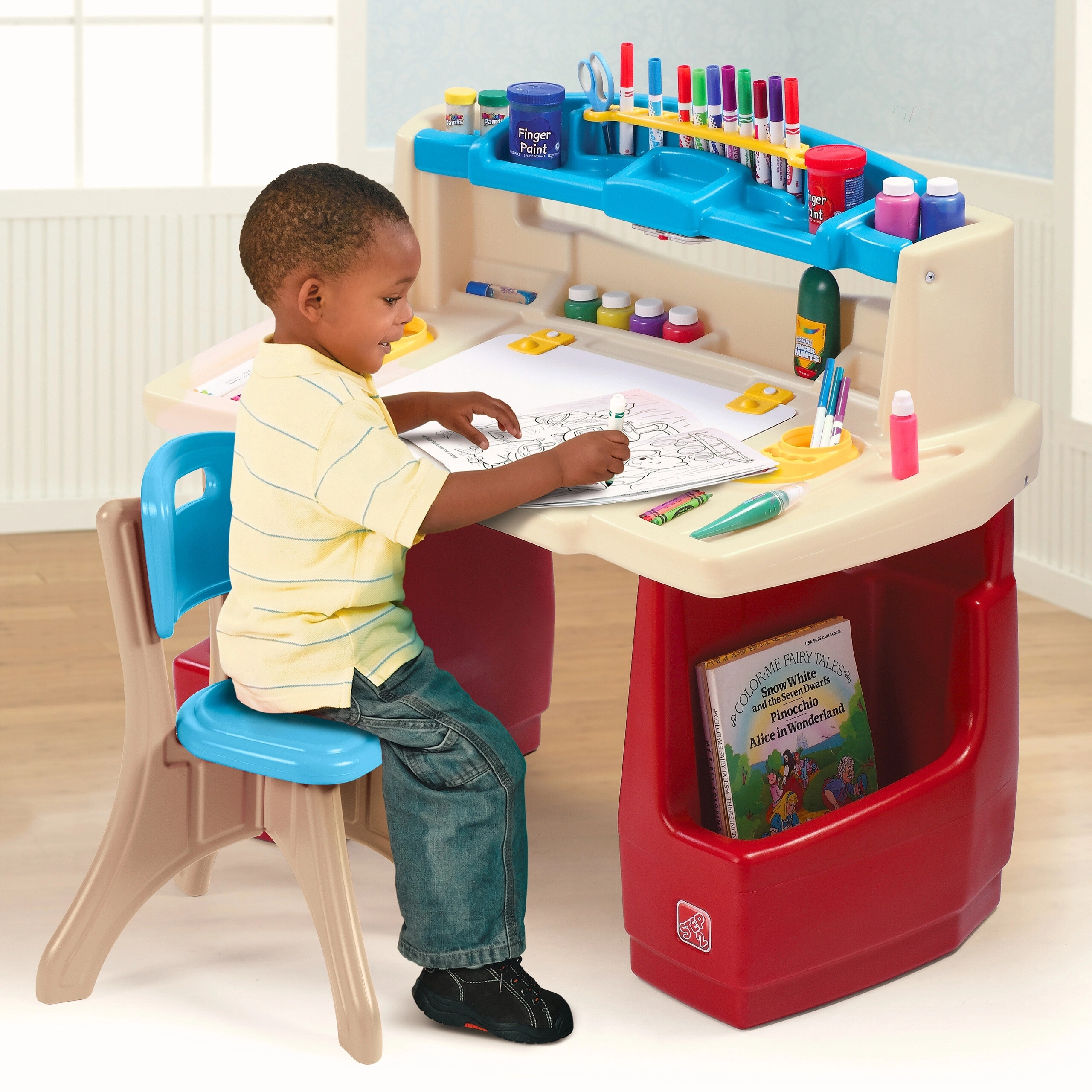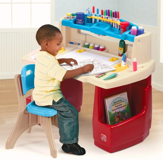 Zestaw STEP2 Deluxe Art Master zamieni pokój dziecka w inspirujące atelier. Dzieci mają do dyspozycji dużą przestrzeń roboczą z odchylaną tablicą suchościeralną, którą łatwo się czyści i która skrywa dodatkowe miejsce na przybory. Górny organizer, boczne kosze i pionowe przegródki utrzymają kredki, farby, książki i tablet zawsze pod ręką.