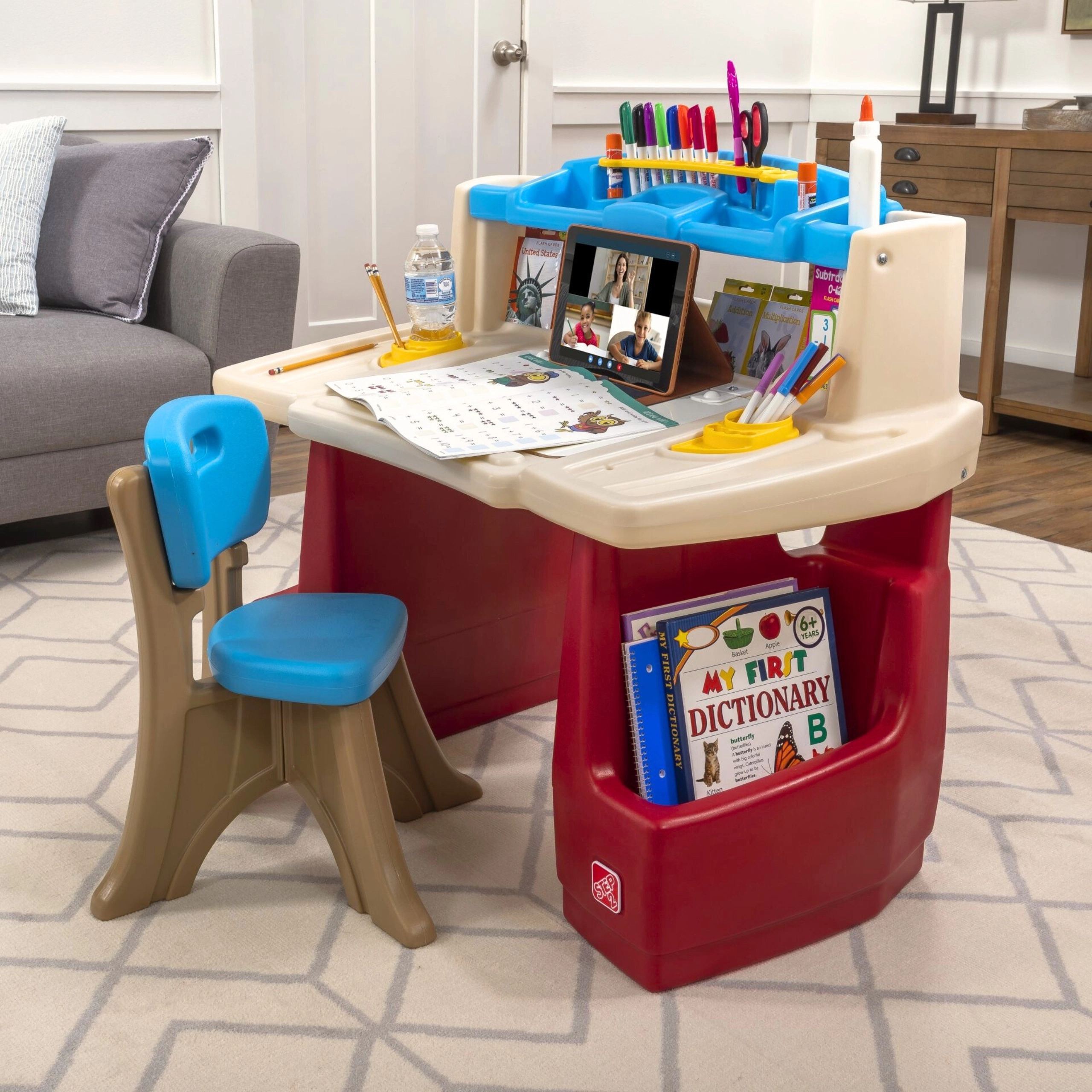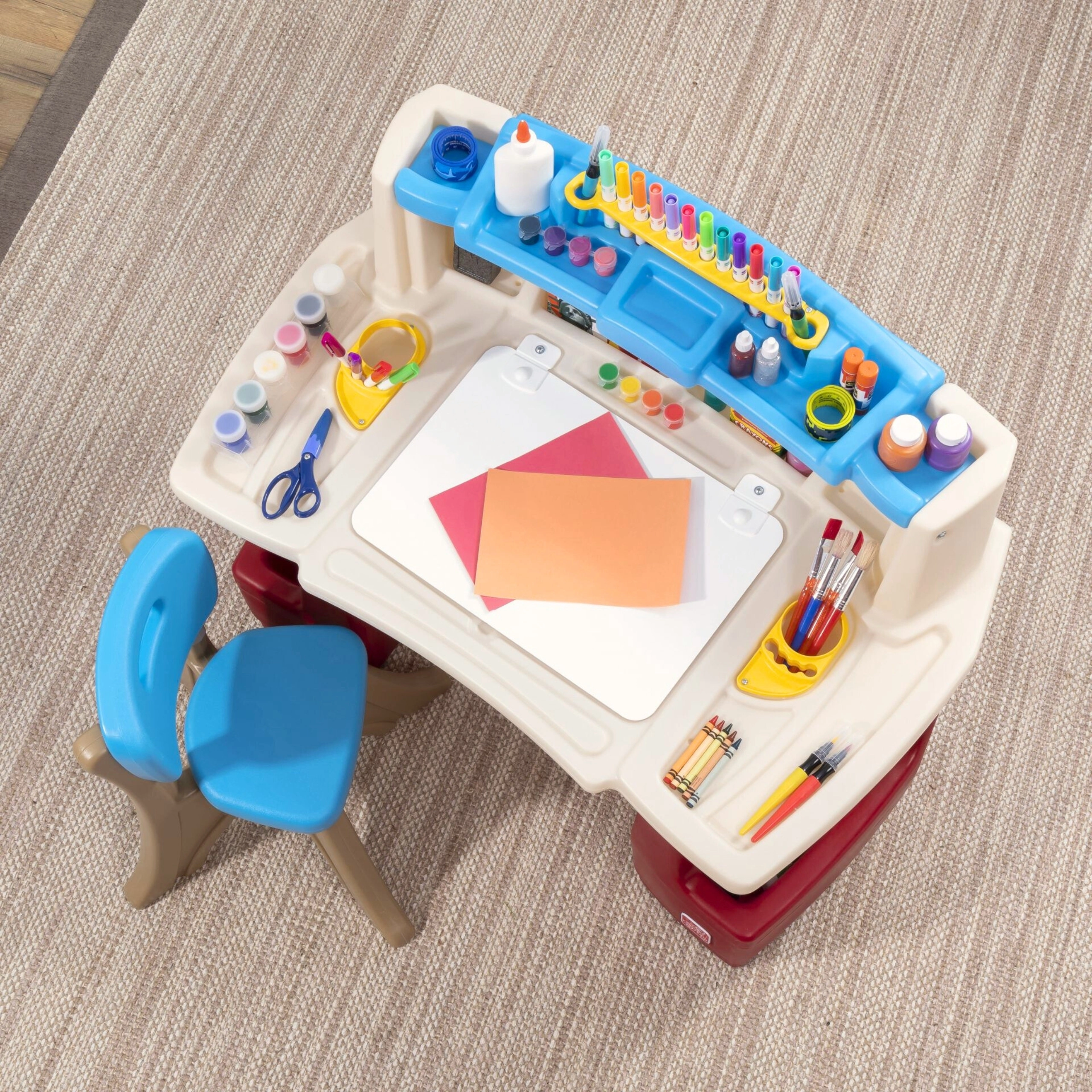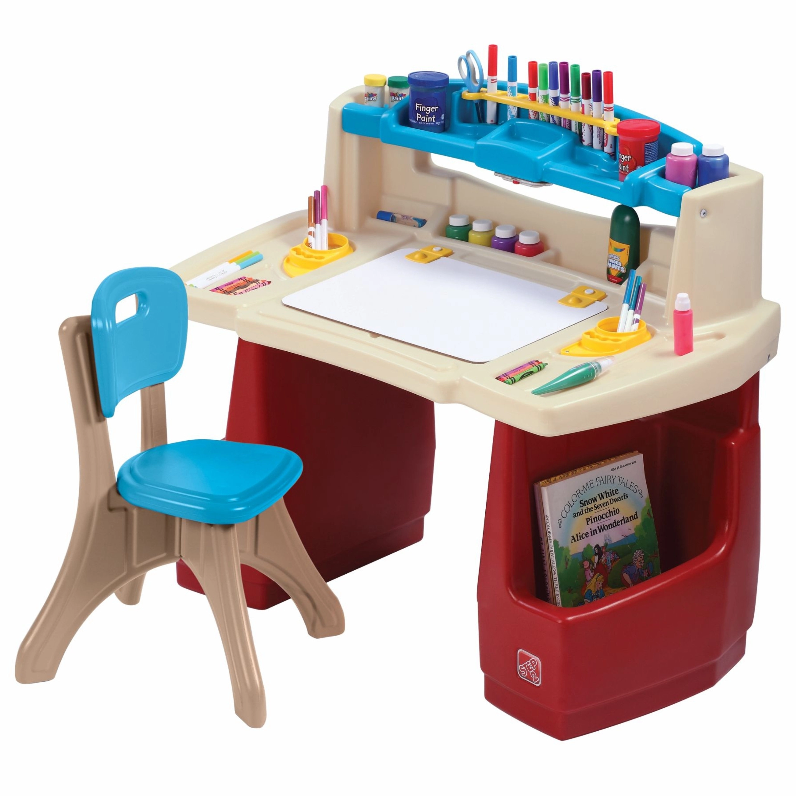 Stwórz dzieciom ich własny kreatywny kącik z zestawem STEP2 Deluxe Art Master. Przestronny stolik roboczy z krzesełkiem oferuje tablicę suchościeralną, liczne przegrody i schowki, półkę na książki lub tablet oraz praktyczną lampkę dotykową. Idealny do rysowania, malowania i nauki – uporządkowane przechowywanie przyborów oraz bezpieczne, stabilne wykonanie.