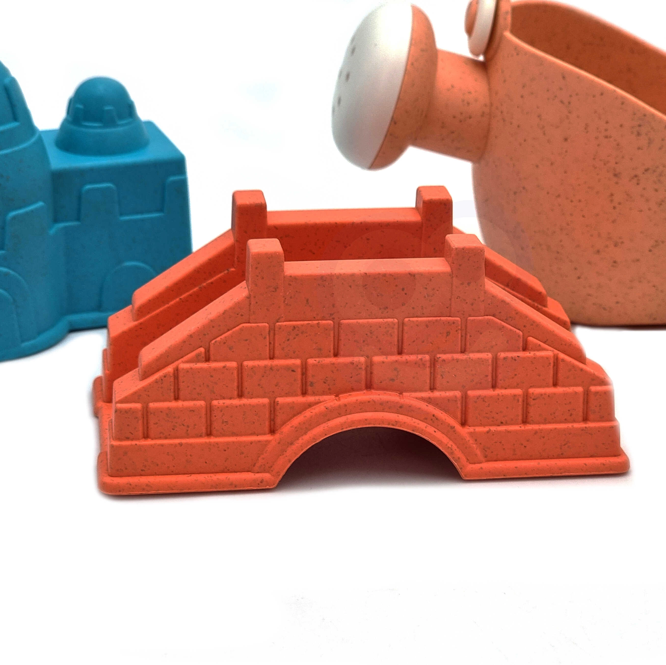 Foremki z motywami murów i mostu pomagają dzieciom tworzyć solidne i detaliczne budowle z piasku – idealne do piaskownicy i na plażę.