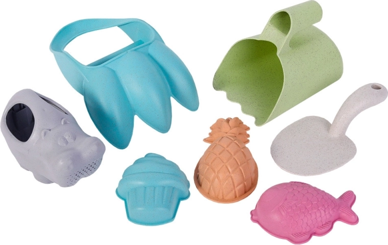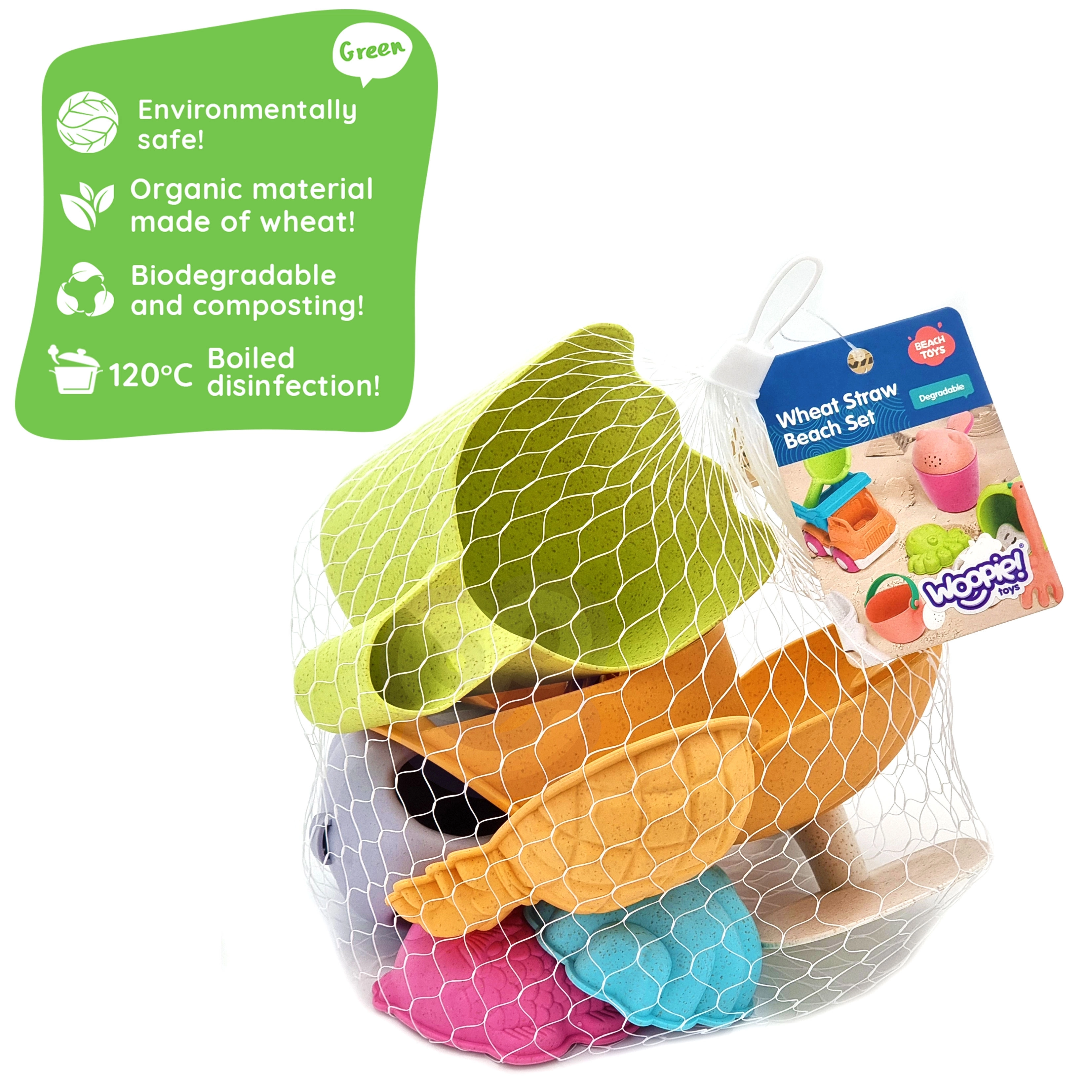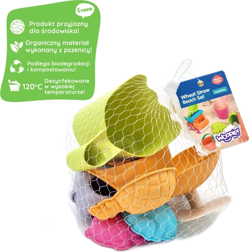Ekologiczny zestaw do piasku WOOPIE GREEN ucieszy dzieci od 3 lat oraz rodziców dbających o przyrodę. Zawiera 7 praktycznych elementów w pastelowym wzornictwie: pazury do piasku, dużą łyżkę, konewkę, 3 foremki, łopatkę i grabki. Wykonany z organicznego, biodegradowalnego materiału, kompostowalny i bezpieczny dla dzieci (dezynfekowany w 120 °C) – idealny do piaskownicy, na plażę i do ogrodu.