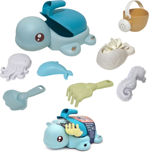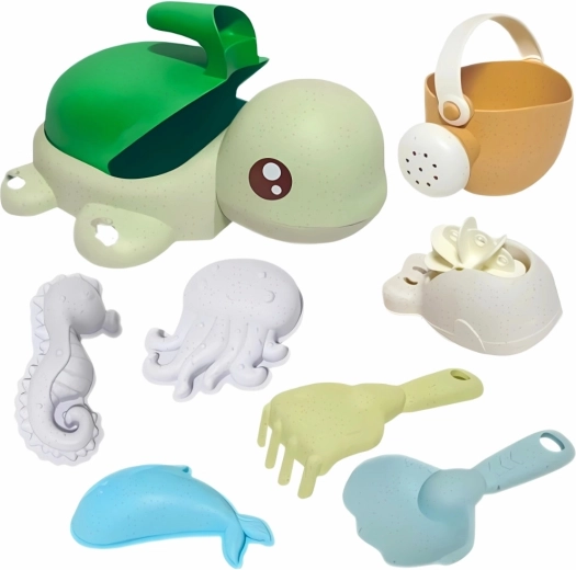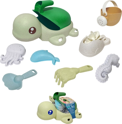 Co znajdziesz w zestawie: wiaderko/żółwik z przyssawkami, konewka, łopatka, grabki, łyżka, koło młynek i 3 foremki (morskie stworzenia). Pastelowe kolory i obłe kształty są przyjazne także dla młodszych dzieci od 3 lat. Materiał jest biodegradowalny i kompostowalny, dzięki czemu dzieci bawią się w sposób odpowiedzialny wobec natury.