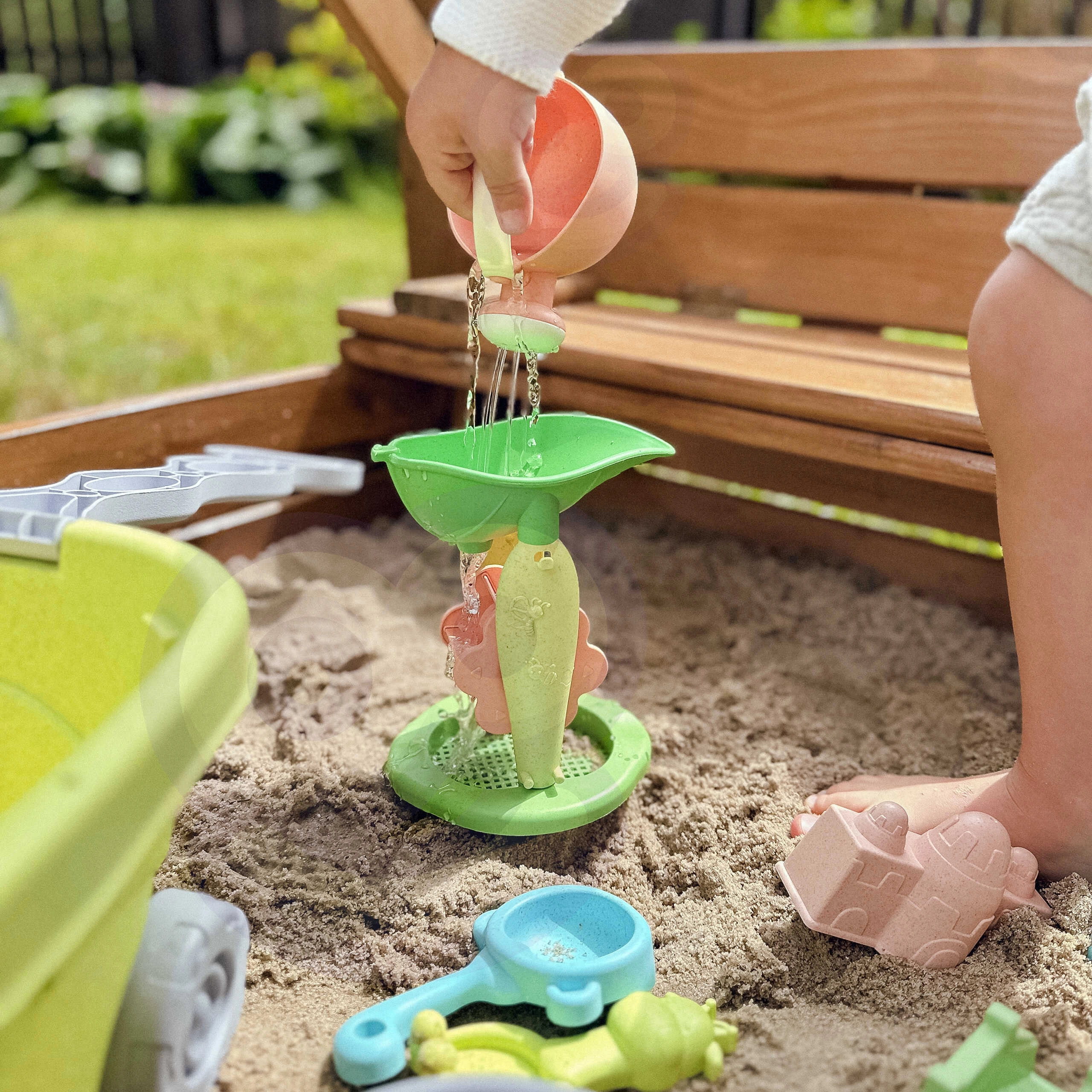 Wsyp piasek lub wlej wodę do lejka i obserwuj, jak obracają się kółka. Zintegrowane sitko pomaga oczyszczać piasek i dodaje zabawie element eksperymentowania.