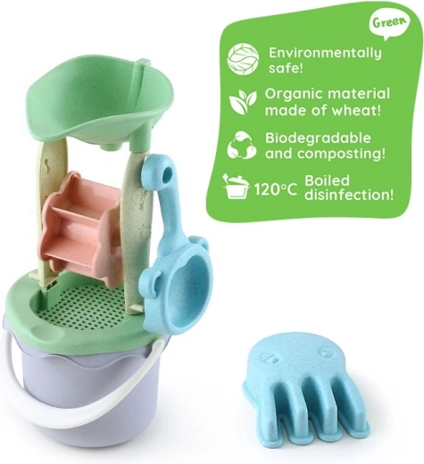 Dziecięcy zestaw do piasku Woopie Green wnosi zabawę do piasku i wody w ekologicznym wydaniu. Zawiera 9 elementów, w tym wiaderko, młynek z sitkiem, konewkę, foremki, łopatkę i grabki. Wszystko wykonane z organicznego i biodegradowalnego materiału w pastelowym wzornictwie. Elementy mają wygodne uchwyty i są bezpieczne dla dzieci – dezynfekowane w 120 °C. Idealne do piaskownicy, na plażę i do ogrodu.