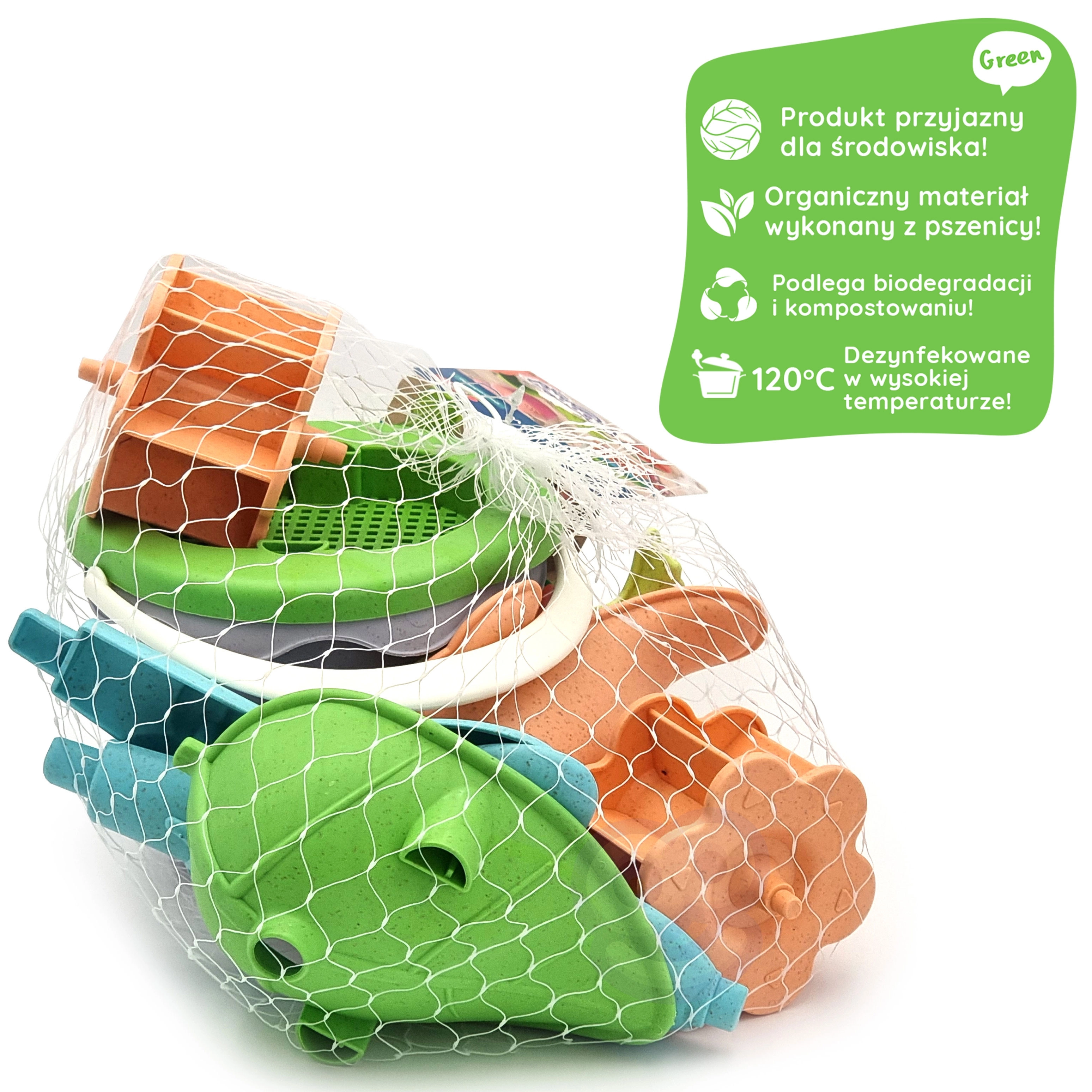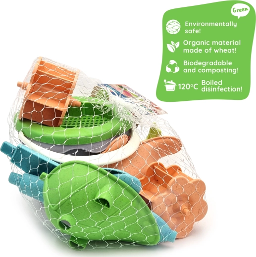 Zestaw wykonano z organicznego, biodegradowalnego materiału pochodzenia roślinnego, który jest kompostowalny. Gładkie kształty, wytrzymały materiał i łatwa pielęgnacja zapewniają bezpieczne i długotrwałe użytkowanie. Pastelowe kolory spodobają się dzieciom i rodzicom oraz świetnie komponują się z innymi zabawkami plażowymi.