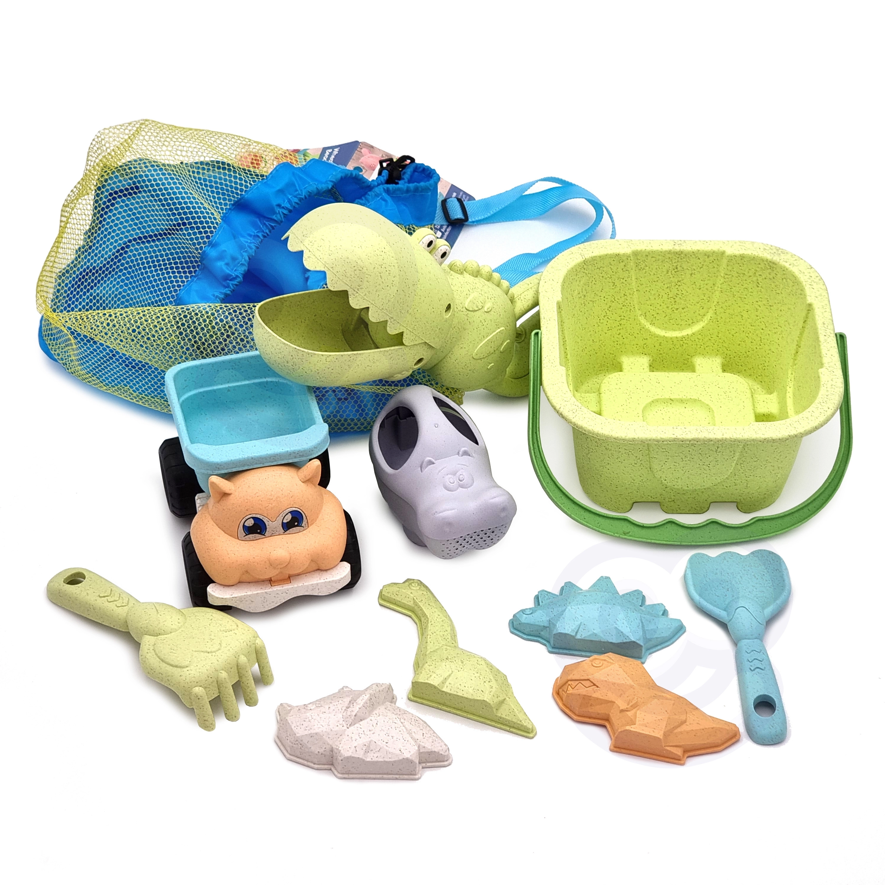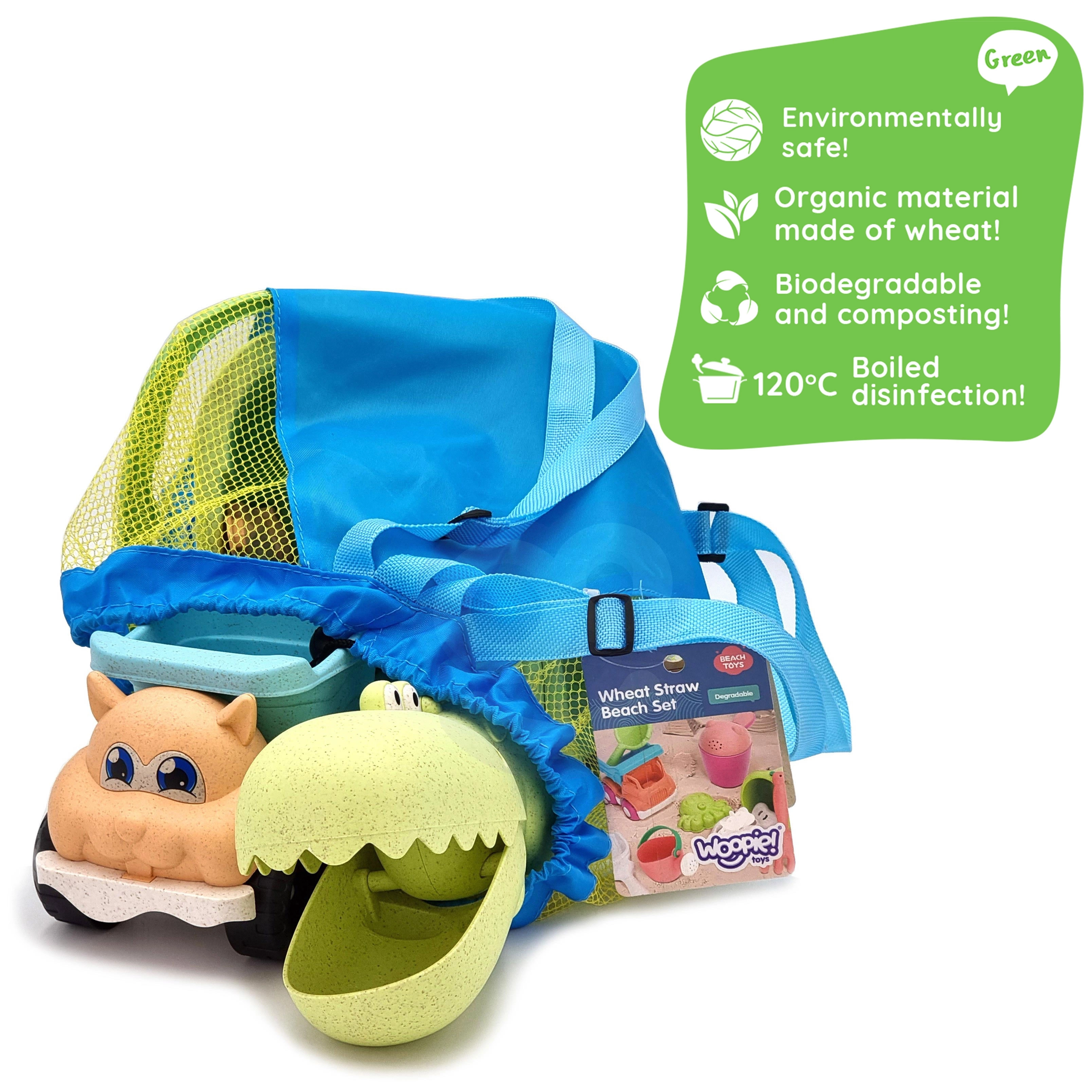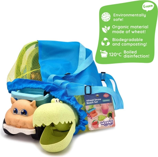 Ekologiczny zestaw do piasku WOOPIE GREEN daje dzieciom wszystko do kreatywnej zabawy w piasku i nad wodą: 10 elementów, wygodne wiaderko z uchwytem, konewkę, foremki, krokodylą łopatkę, grabki i samochodzik. Wykonany z organicznego, biodegradowalnego materiału i dostarczany w praktycznym plecaku. Bezpieczny dla dzieci, dezynfekowany w 120 °C, idealny na plażę, do piaskownicy i na ogród.
