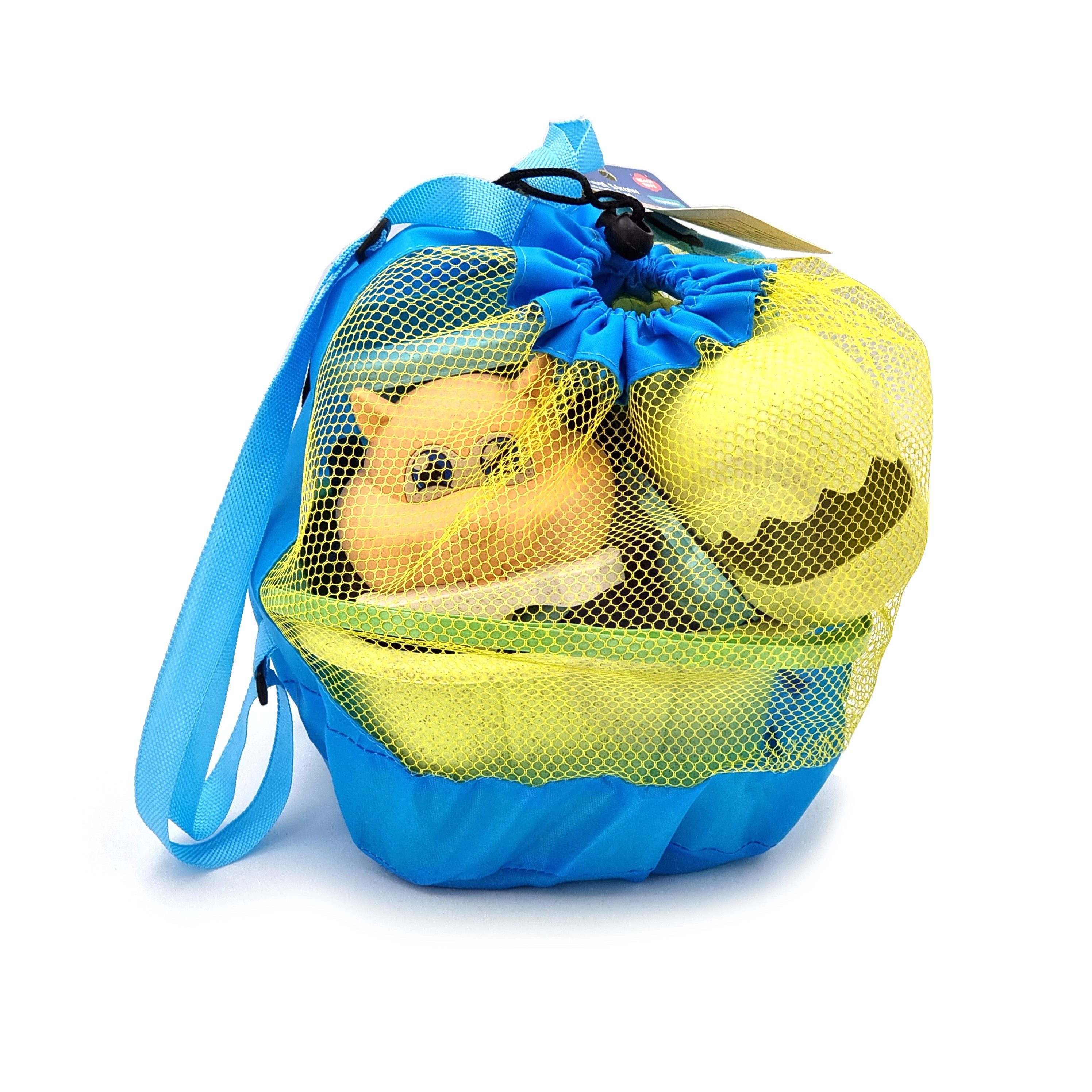 Lekki siatkowy worek służy jako plecak – łatwe przenoszenie, szybkie ociekanie i suszenie zabawek, mniej piasku w torbie po drodze z plaży.
