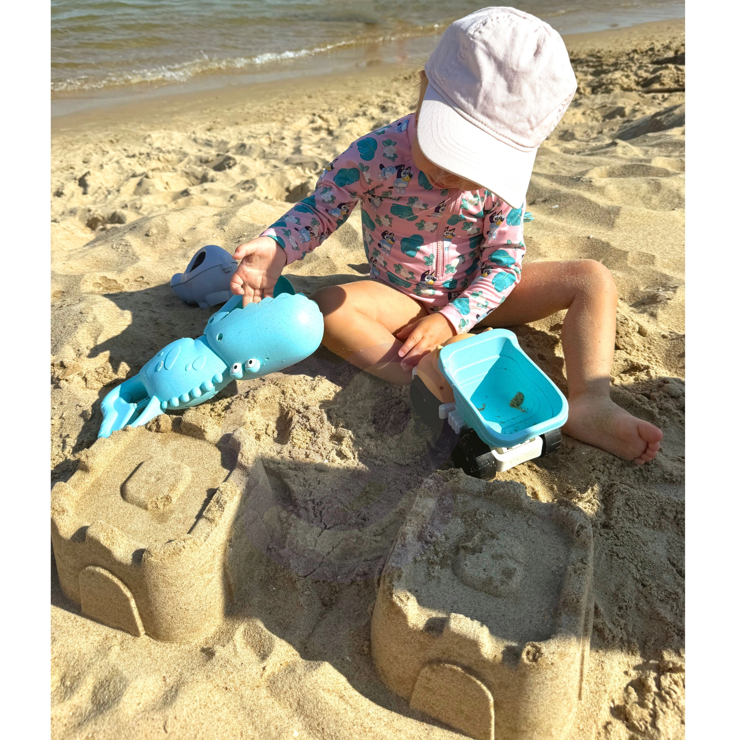 Zestaw wspiera rozwój dziecięcej motoryki, koordynacji ręka–oko, wyobraźni i myślenia przestrzennego. Dzięki samochodzikowi, krokodylemu nabierakowi i foremkom dzieci budują zamki, przesypują piasek i przewożą ładunek. Wszystkie elementy są lekkie, o lubianych zwierzęcych kształtach i przyjaznych obrysach dla bezpiecznej zabawy.