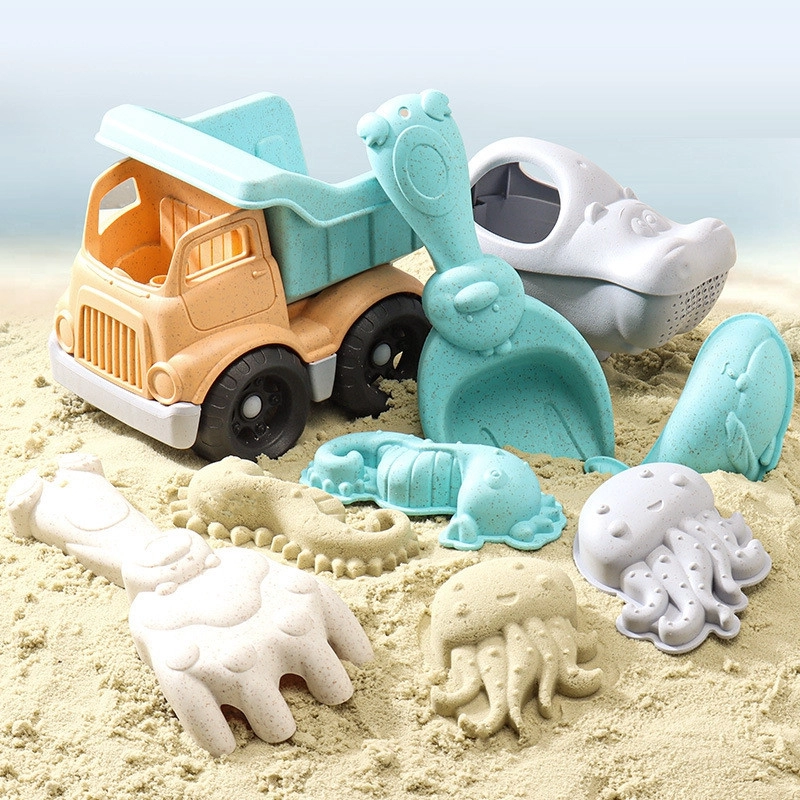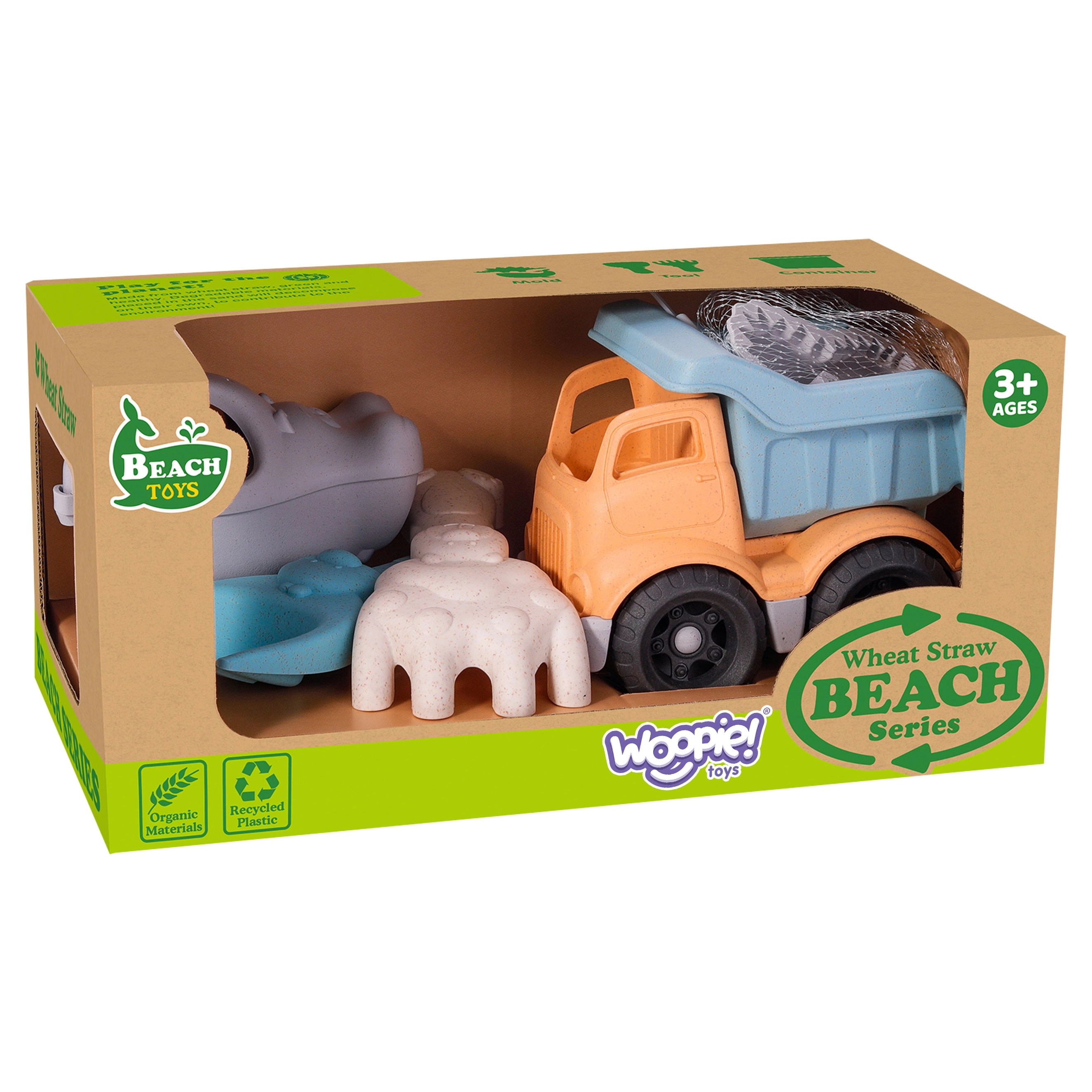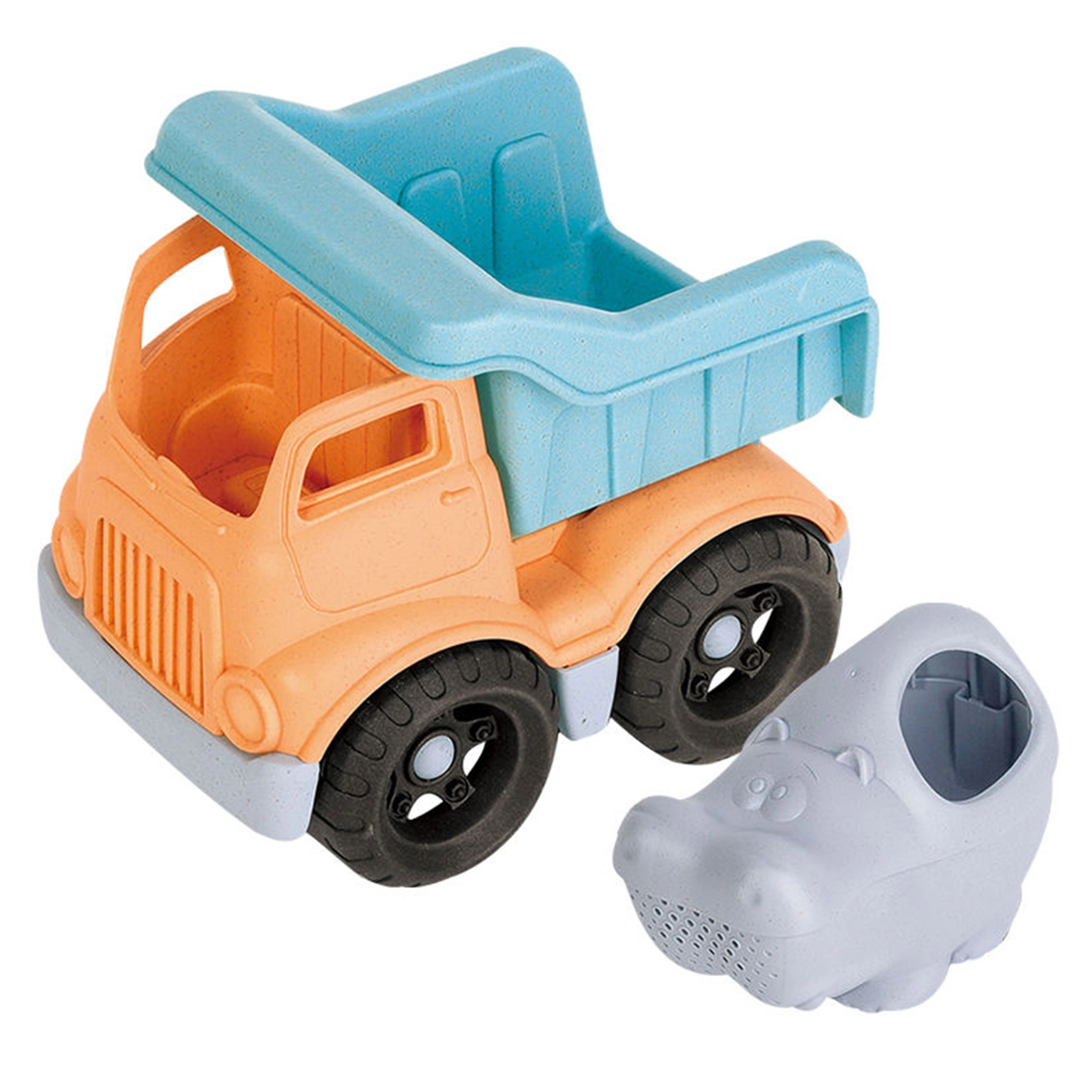 Praktyczna wywrotka z uchylną skrzynią, urocza konewka w kształcie hipopotama, łopatka, grabki oraz trzy morskie foremki zapewnią godziny zabawy przy budowaniu, przenoszeniu i tworzeniu. Zabawa zestawem rozwija małą i dużą motorykę, koordynację ręka–oko, myślenie przestrzenne oraz umiejętności społeczne.