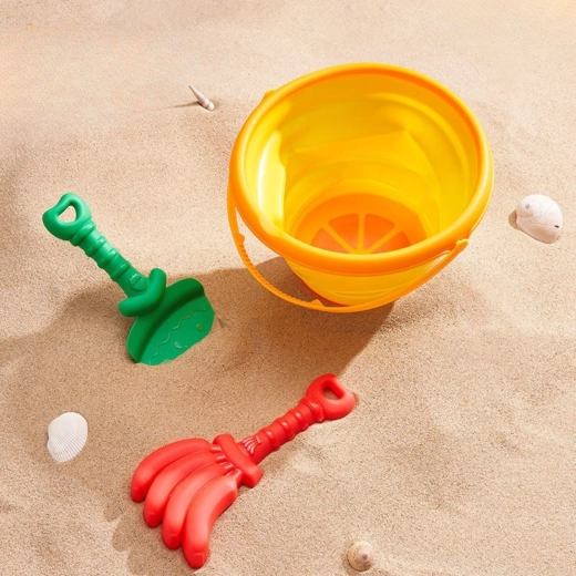 Ten wszechstronny zestaw do piasku łączy praktyczne wykonanie z radosnym, tropikalnym motywem. Składane wiaderko oszczędza miejsce w plecaku lub wózku, a lekkie akcesoria dobrze leżą w dziecięcych dłoniach. Dzięki solidnemu i bezpiecznemu materiałowi zestaw świetnie sprawdzi się w codziennej zabawie na plaży i w piaskownicy.