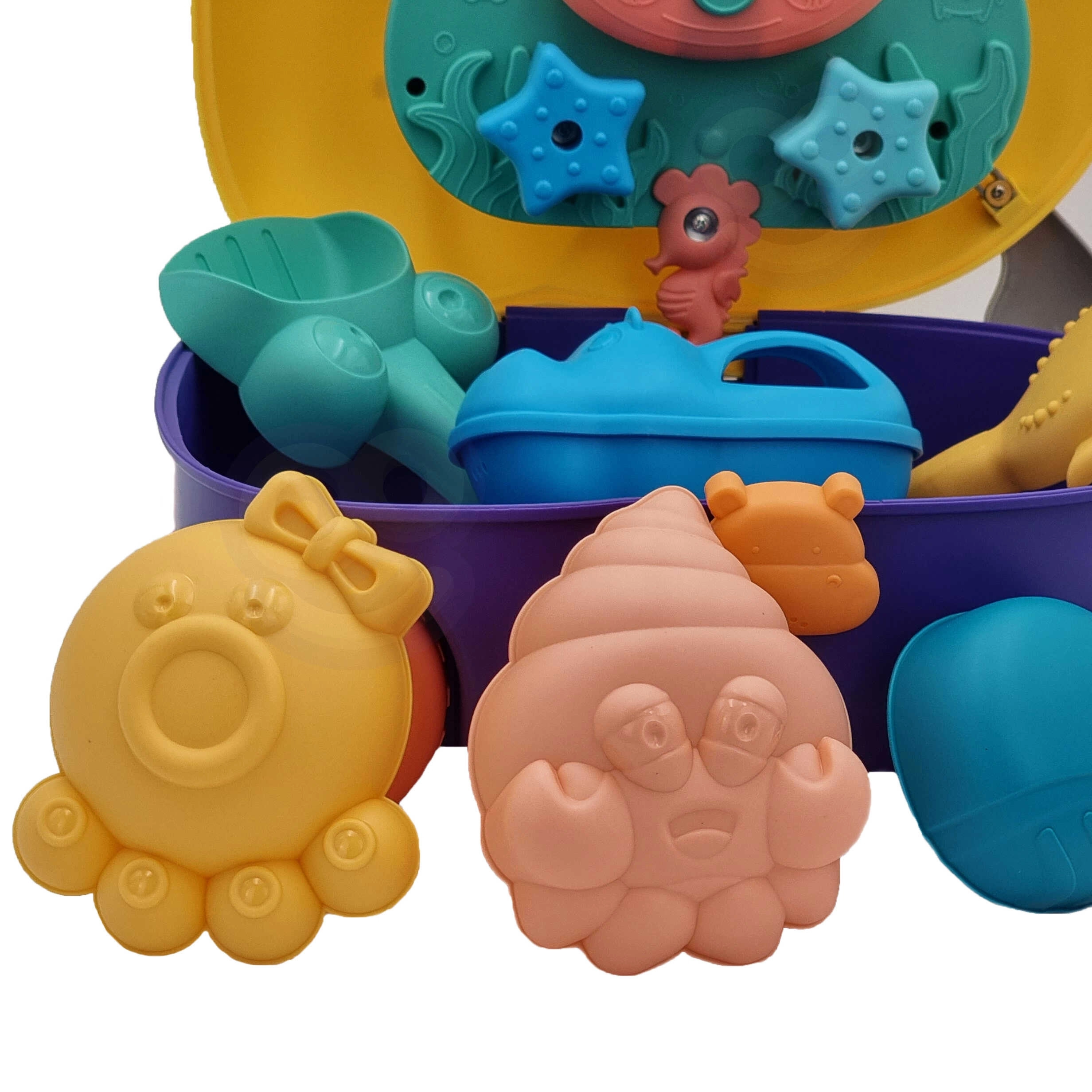W skład wchodzi 8 elementów: kuferek/pojemnik, kubeczek do przelewania, foremki, łopatka i grabki do zabawy w piasku i przy wodzie. Zabawka wspiera małą motorykę, koordynację ręka–oko oraz percepcję sensoryczną. Nadaje się do zabawy w domu i na zewnątrz – w łazience, w ogrodzie i na wakacjach.