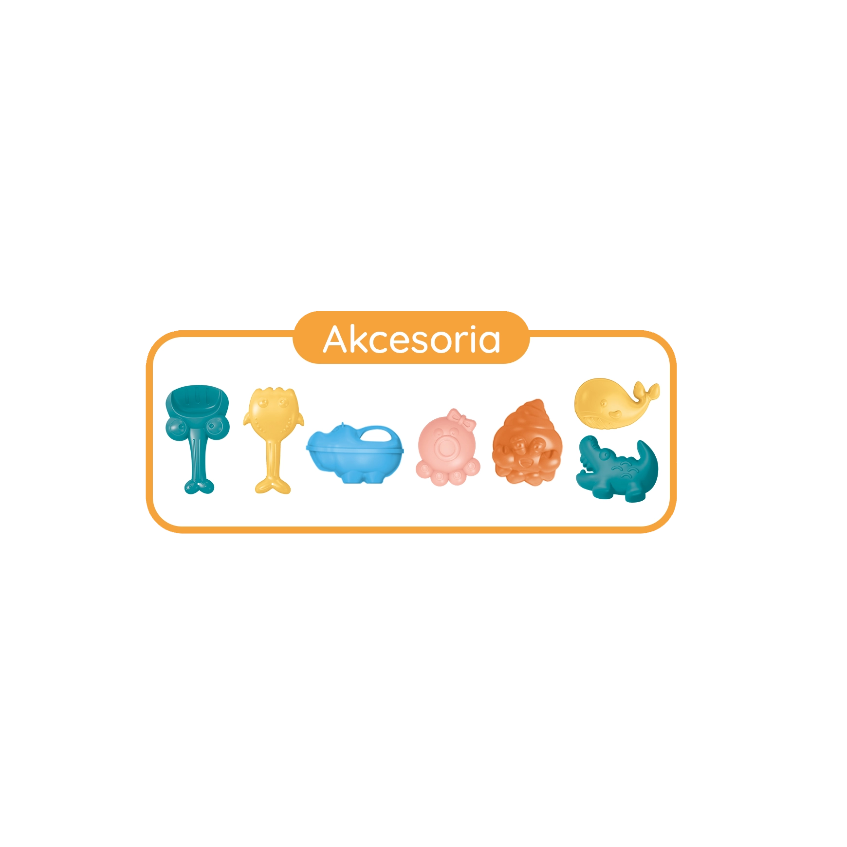 W zestawie znajduje się kubeczek do nalewania, grabki, łopatka i foremki. Idealny do piaskownicy, na plażę i do łazienki – zabawa dla jednego lub dwojga dzieci.