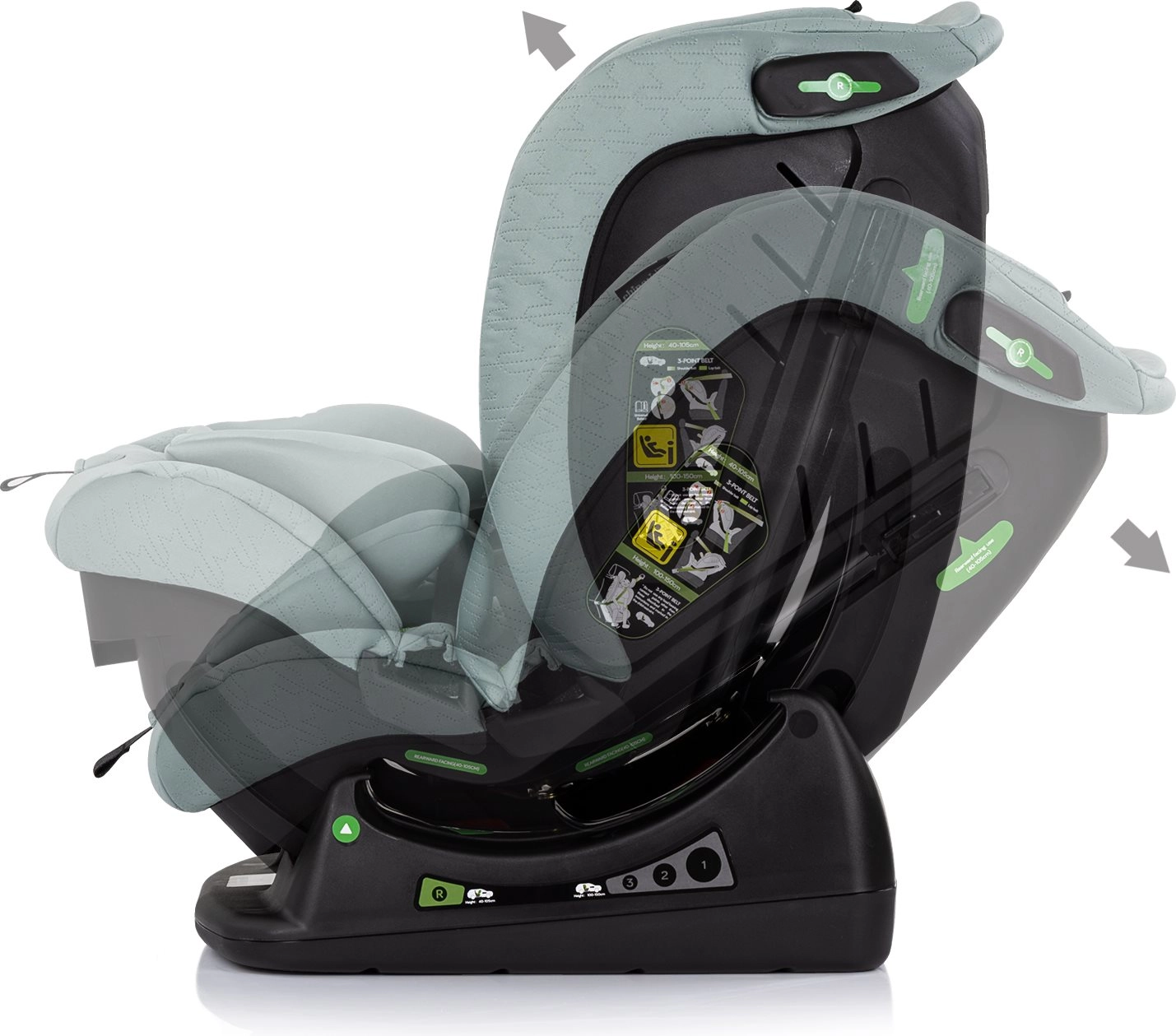Regulowany zagłówek oraz regulowane długościowo 5‑punktowe pasy z miękkimi osłonkami zapewniają idealne dopasowanie i bezpieczne zapięcie w każdym wieku.