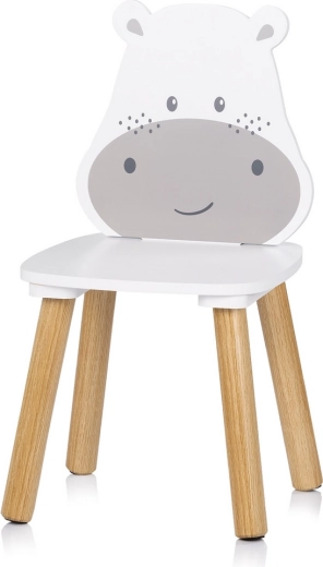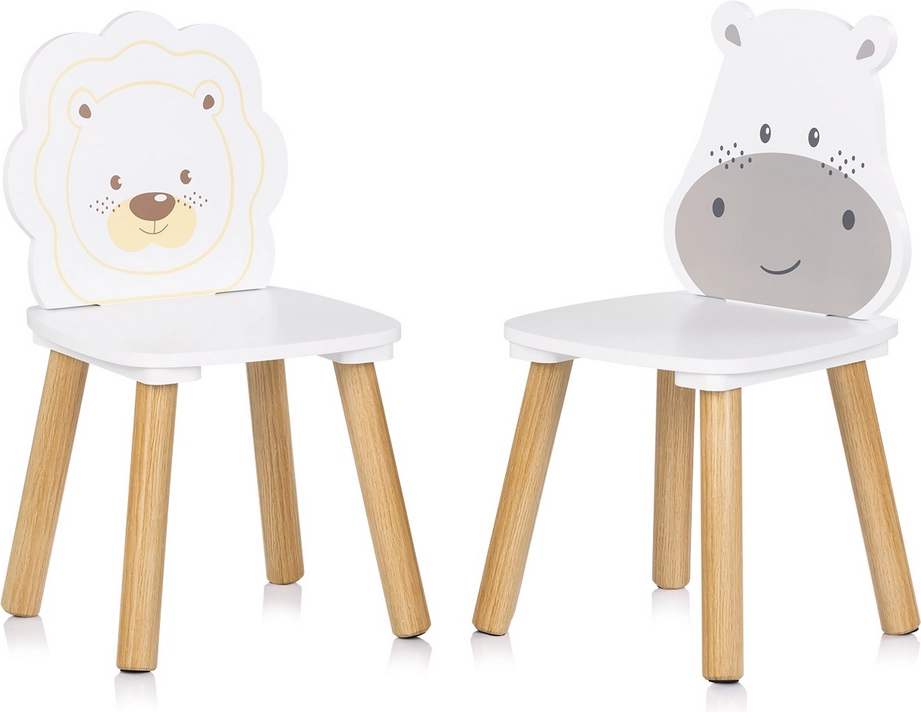 Dwa krzesełka z uroczymi zwierzęcymi oparciami – hipopotam i lew – pobudzają wyobraźnię i sprawiają, że nauka oraz zabawa są przyjemniejsze.