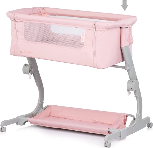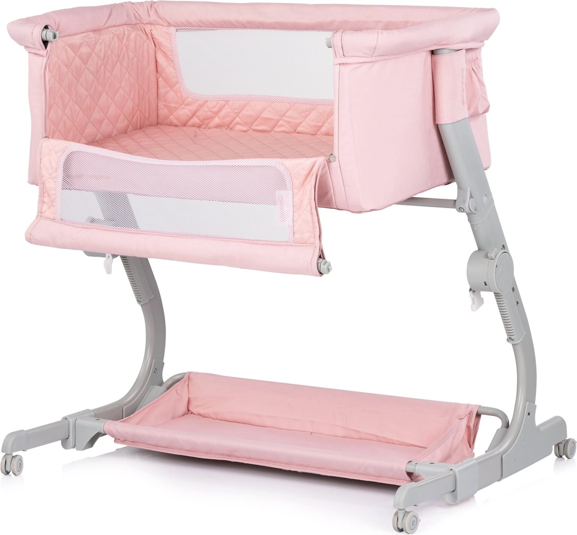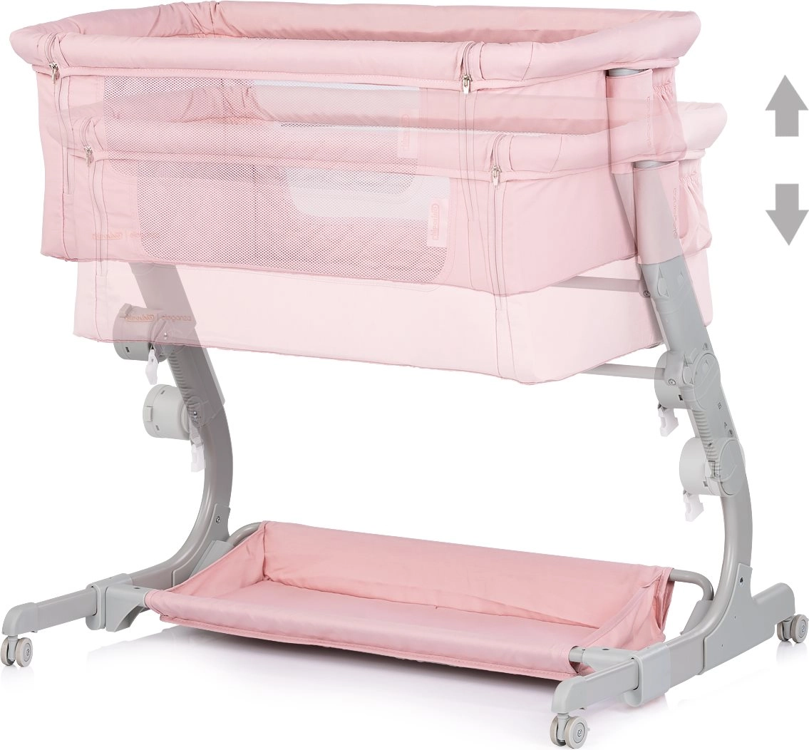 Praktyczne dziecięce łóżeczko i dostawka 2w1 CHIPOLINO Eleganza w delikatnym różowym odcieniu zapewni maluszkowi bezpieczne i przytulne miejsce do snu i odpoczynku. Dzięki 3 poziomom wysokości, siatkowanym bokom dla nadzoru i cyrkulacji powietrza, blokowanym kółkom oraz lekkiej, a jednocześnie stabilnej metalowej konstrukcji jest idealna do codziennego użytku i podróży – w zestawie kompaktowa torba podróżna.
