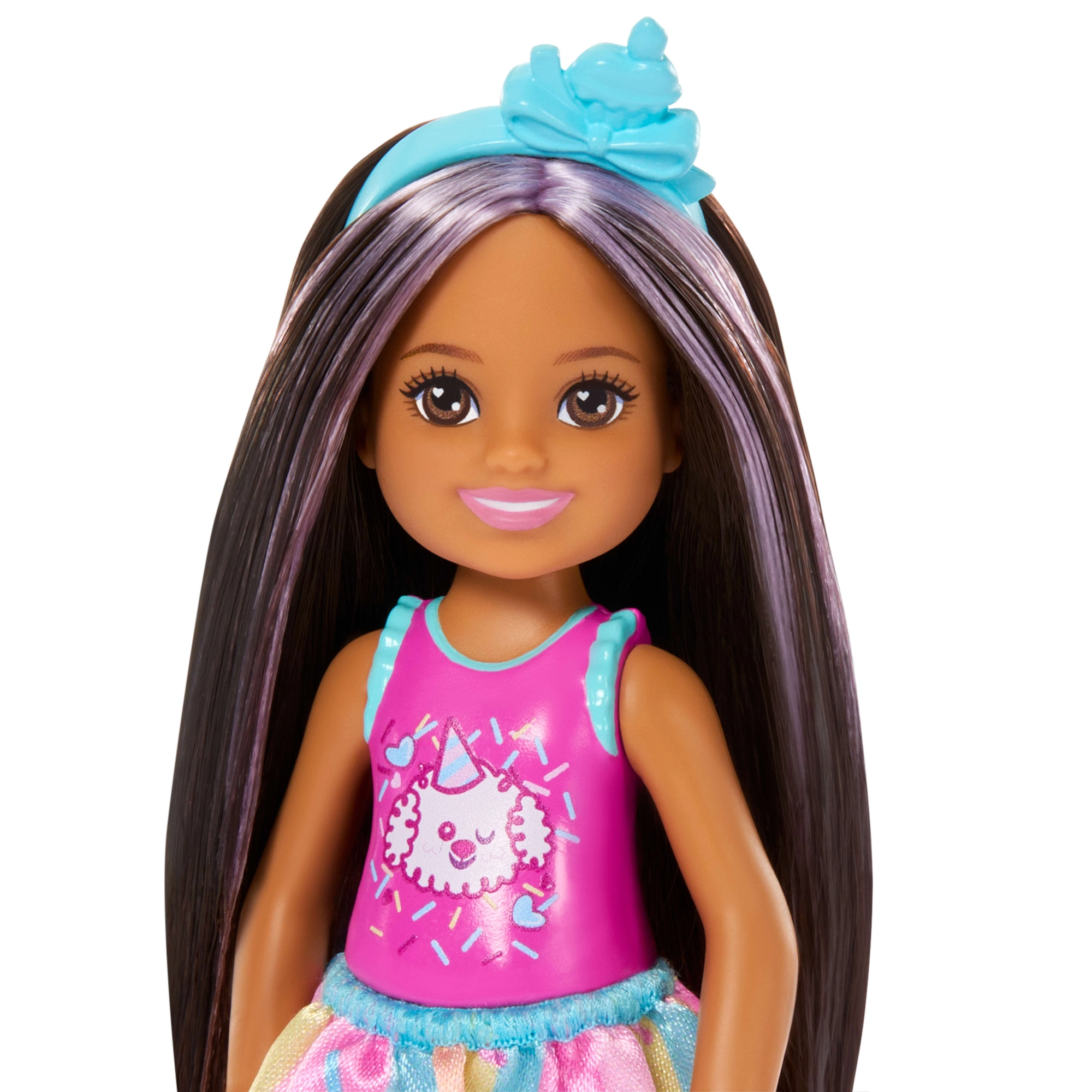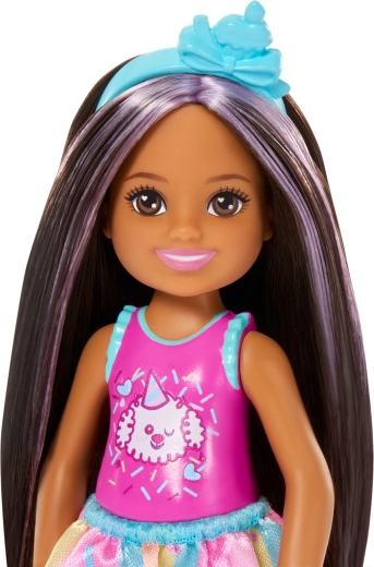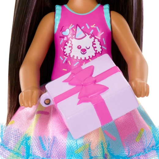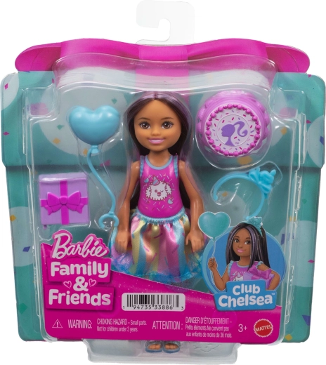 Urocza laleczka Barbie Club Chelsea wnosi urodzinową zabawę do każdej gry. Mała lalka o wysokości ok. 13 cm ma długie ciemne włosy z fioletowymi pasemkami, nosi uroczy top ze szczeniaczkiem, kolorową spódniczkę i jasnoniebieskie sandałki. W zestawie znajdują się tematyczne akcesoria na urodzinową imprezę – balonik, prezent, opaska i tort – które wspierają kreatywne odgrywanie ról i tworzenie własnych historii.
