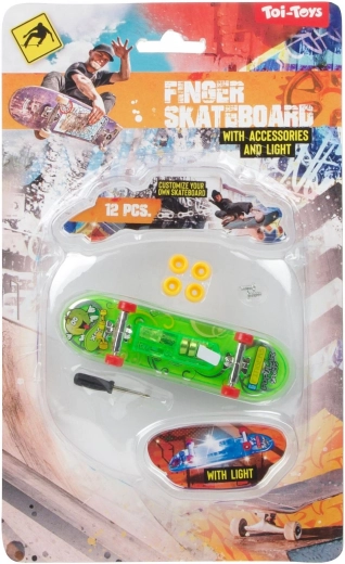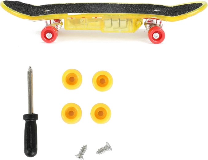 Ten palcowy skateboard łączy atrakcyjny design z praktycznymi funkcjami. Przezroczysta plastikowa deska z powierzchnią typu grip zapewnia stabilność palców, a czerwone kółka i metalowe trucki gwarantują płynną jazdę. Zintegrowane światło LED dodaje trikom efektu i frajdy nawet przy słabszym oświetleniu.