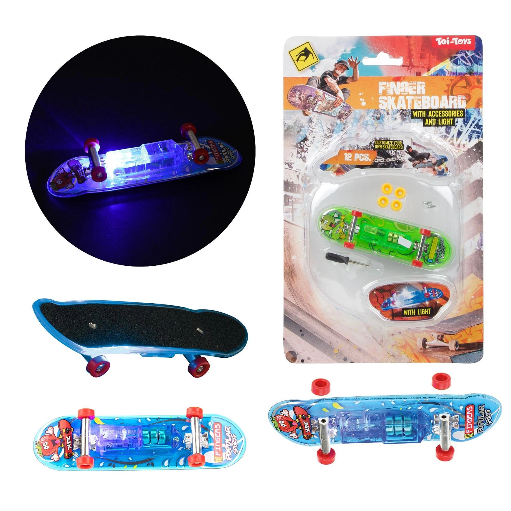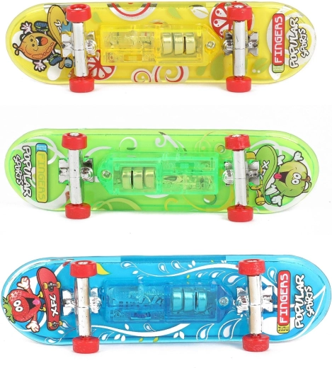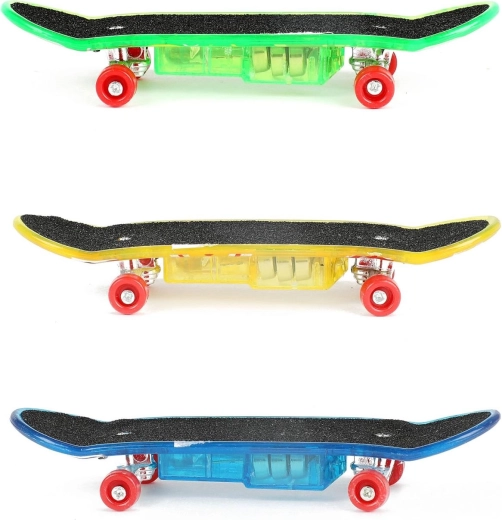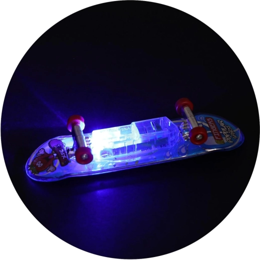 Zabawny palcowy skateboard o długości 9,5 cm, zasilany bateriami i z wbudowanym oświetleniem LED dla efektownej jazdy i trików. Kompaktowy rozmiar, wytrzymałe wykonanie oraz świecące efekty spodobają się dzieciom i początkującym miłośnikom fingerboardingu. Dostępny w 3 wyrazistych kolorach z przezroczystym podwoziem, metalowymi truckami i gładko toczącymi się kółkami.