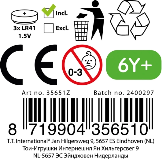 - Efekty świetlne: wbudowane diody LED na baterie dla efektownej zabawy.