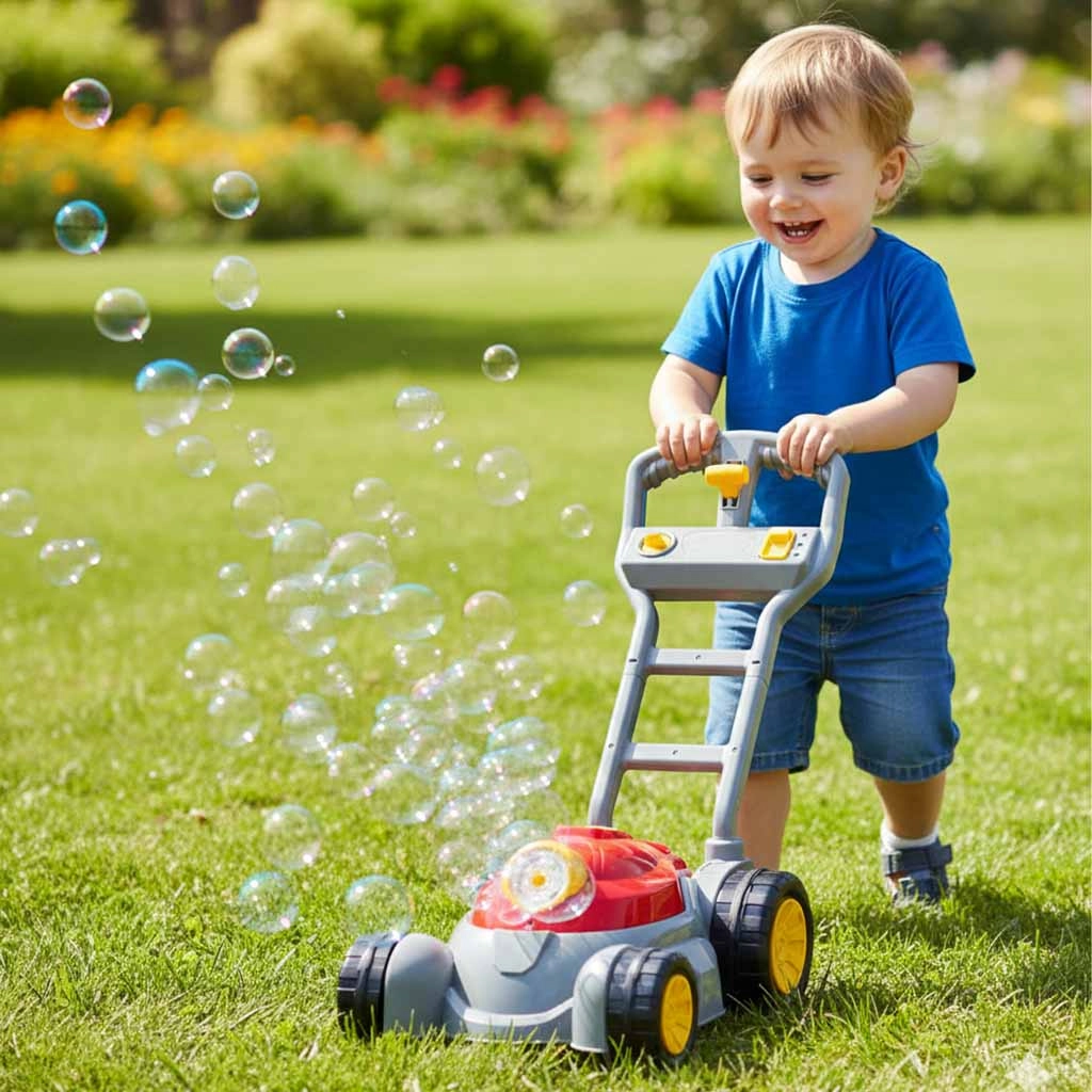 Ta realistycznie wykonana dziecięca kosiarka zamienia każdy krok w wir kolorowych baniek mydlanych. Dzięki automatycznemu wypuszczaniu baniek, niebieskiemu podświetleniu i przyjemnym efektom dźwiękowym dzieci czerpią mnóstwo radości z aktywnej zabawy w ogrodzie, na tarasie i w domu.