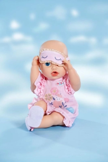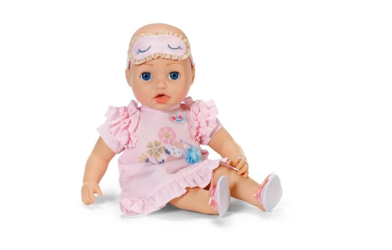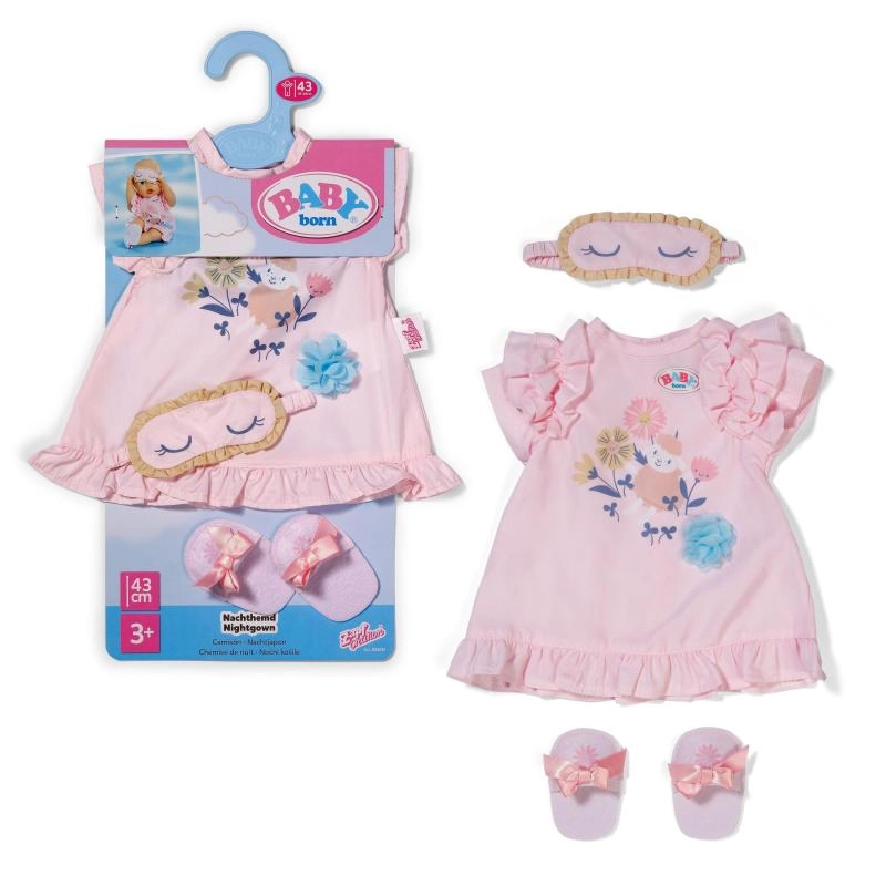 Uroczy zestaw do wieczornych rytuałów dla lalek: miękka koszulka nocna z falbankami, wygodne kapcie i maska do spania. Zabawny design z delikatnymi motywami i pastelowe kolory sprawiają, że to idealny strój do realistycznego usypiania lalek w rozmiarze 43 cm, a także dla misia BABY born.