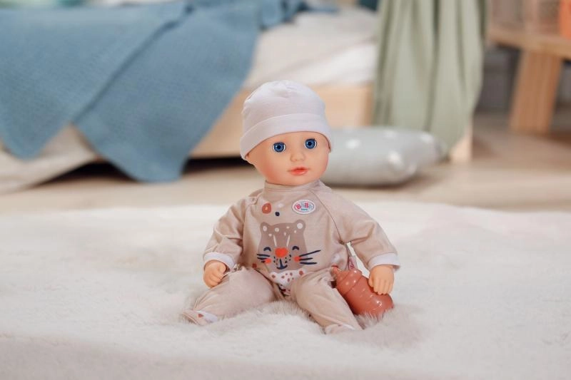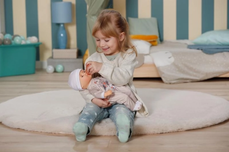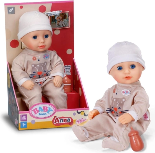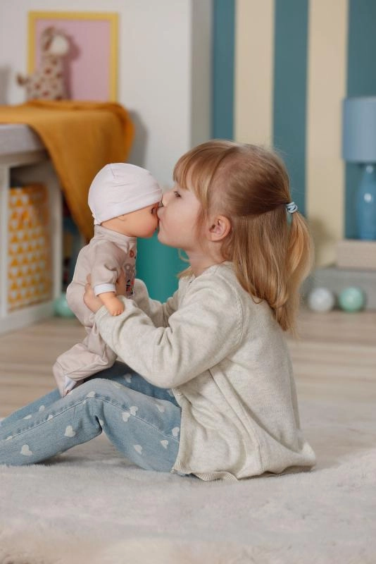 Lalka BABY born Anna beżowa wspiera małą motorykę, wyobraźnię i umiejętności opiekuńcze. Jej miękkie ciałko zachęca do przytulania i wspólnego zasypiania, a oczy zamykane delikatnie opadają po położeniu. Stylowe śpioszki z nadrukiem tygryska i dopasowana czapeczka tworzą uroczy strój do codziennej zabawy.