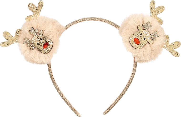 Wprowadź magiczną atmosferę świąt z elegancką opaską SOUZA. Dzięki cienkiej, 0,8 cm, metalowej bazie pokrytej błyszczącą wstążką, wygodnie się nosi i zachowuje kształt przez cały dzień. Dwa miękkie beżowe pompony z aplikacją uroczych reniferków oraz porożem posypanym złotym brokatem nadają każdej fryzurze figlarny, a jednocześnie wciąż gustowny wygląd.