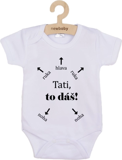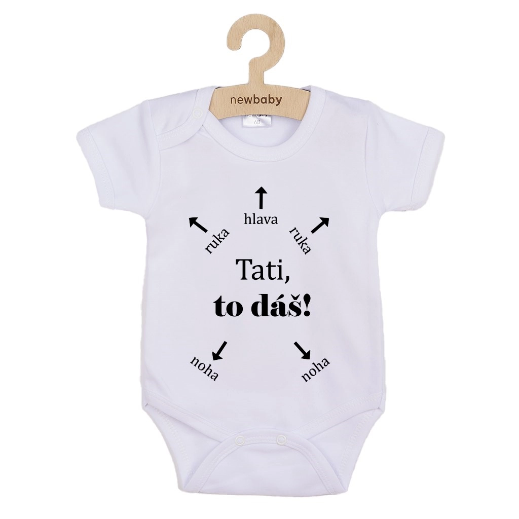 Wygodne body niemowlęce z krótkim rękawem i oryginalnym napisem Tato, dasz radę! marki NEW BABY. Wykonane w 100% z delikatnej bawełny, która jest miękka, przewiewna i łagodna dla wrażliwej skóry maluszka. Praktyczne zapięcie na napy na ramieniu i w kroku ułatwia ubieranie oraz przewijanie. Kolory nadruku są certyfikowane i bezpieczne dla niemowląt.