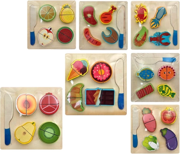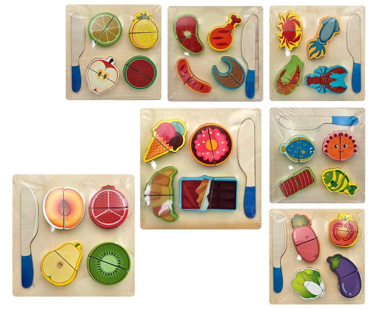 Zestaw jest dostępny w kilku motywach, na przykład owoce, warzywa czy pieczywo. Każdy element wykonany jest z wytrzymałego drewna z gładkimi krawędziami dla bezpiecznej zabawy. Cena dotyczy jednej sztuki/wariantu – idealne do stopniowego rozszerzania dziecięcej kolekcji produktów spożywczych.