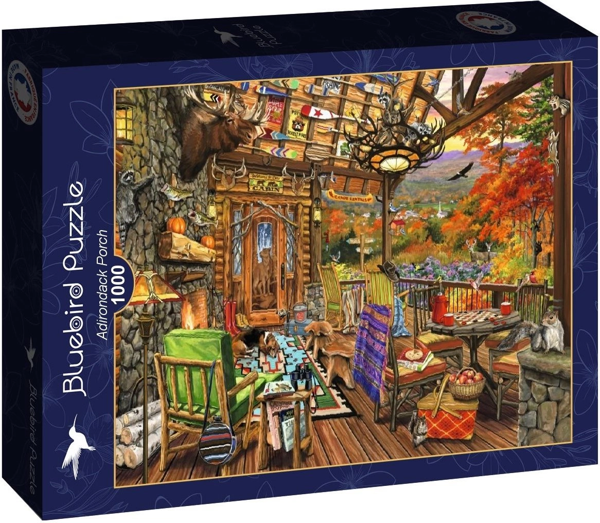 Odkryj atmosferę spokojnej werandy z motywem krzeseł Adirondack i daj się porwać szczegółowej ilustracji. Puzzle z 1000 elementów zapewniają przyjemne wyzwanie dla początkujących i doświadczonych miłośników układanek, a po złożeniu tworzą dekoracyjny obraz o wymiarach ok. 69 × 47,8 cm.