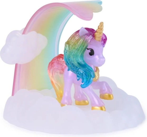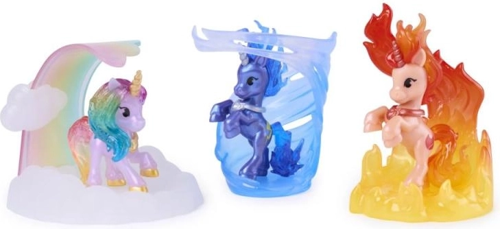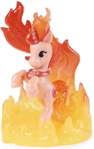 Każda figurka stoi na unikatowej, przezroczystej podstawce – fala, ogień, lód, wiatr, liście lub tęczowe chmury dodają gablotce magicznego efektu i zapewniają stabilność.