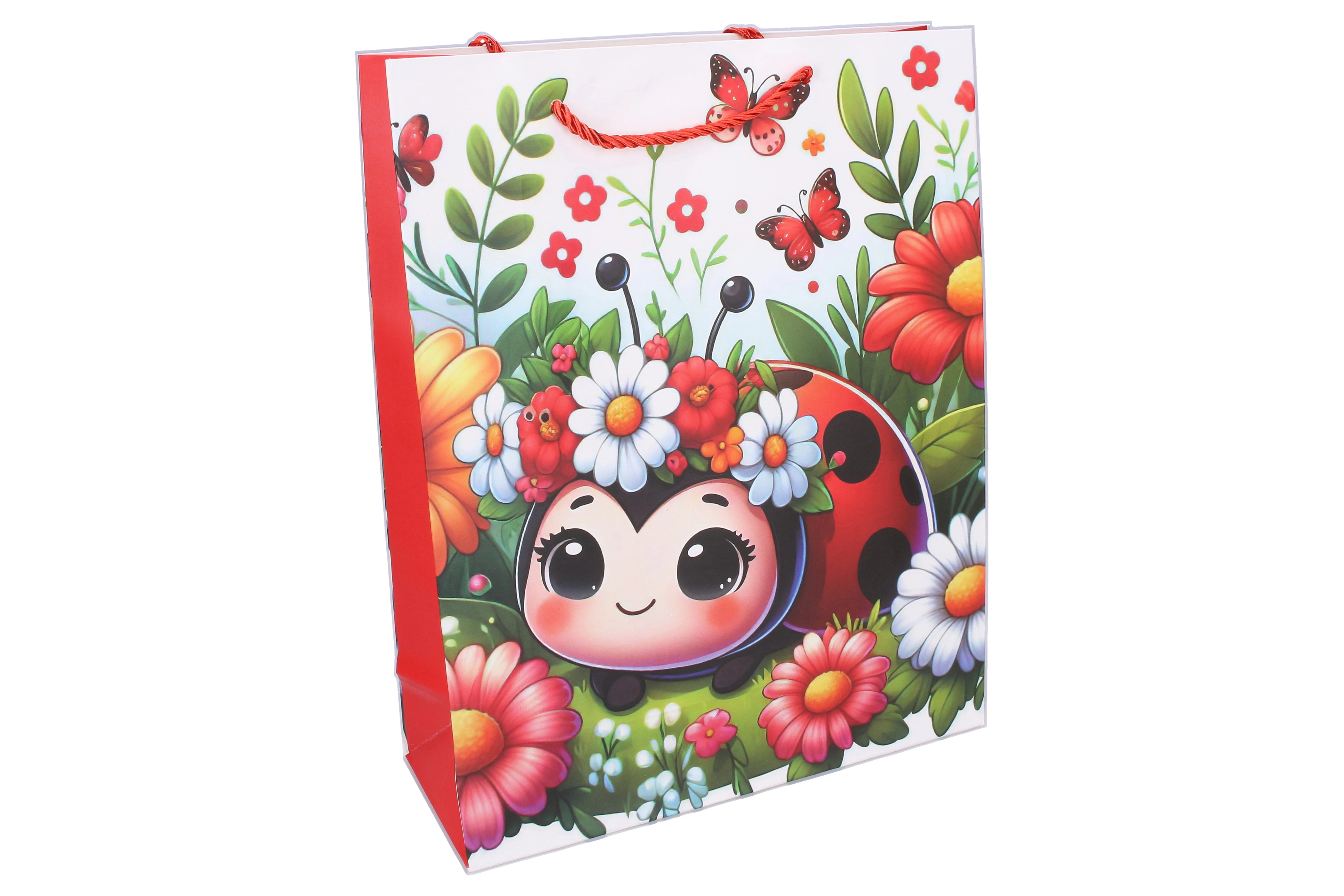 Zamień wręczanie prezentów w małe święto. Dziecięca torebka prezentowa z motywem biedronki oferuje radosny design, solidne uszy dla wygodnego noszenia oraz uniwersalny rozmiar M, który pasuje do większości dziecięcych upominków. Świetne rozwiązanie, gdy chcesz mieć ładnie zapakowany prezent w mgnieniu oka.