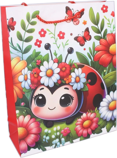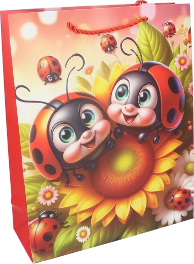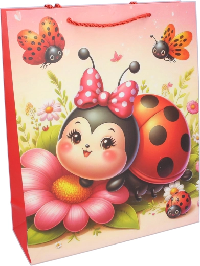 Urocza torebka prezentowa w kompaktowym rozmiarze S (18 × 24 × 8,5 cm) z dziecięcym motywem biedronki ucieszy małych i dużych. Idealna na mniejsze prezenty, zabawki i drobiazgi. Oferuje 4 atrakcyjne warianty, jest solidna, praktyczna i dzięki kolorowemu nadrukowi wywoła radość już przy wręczaniu.