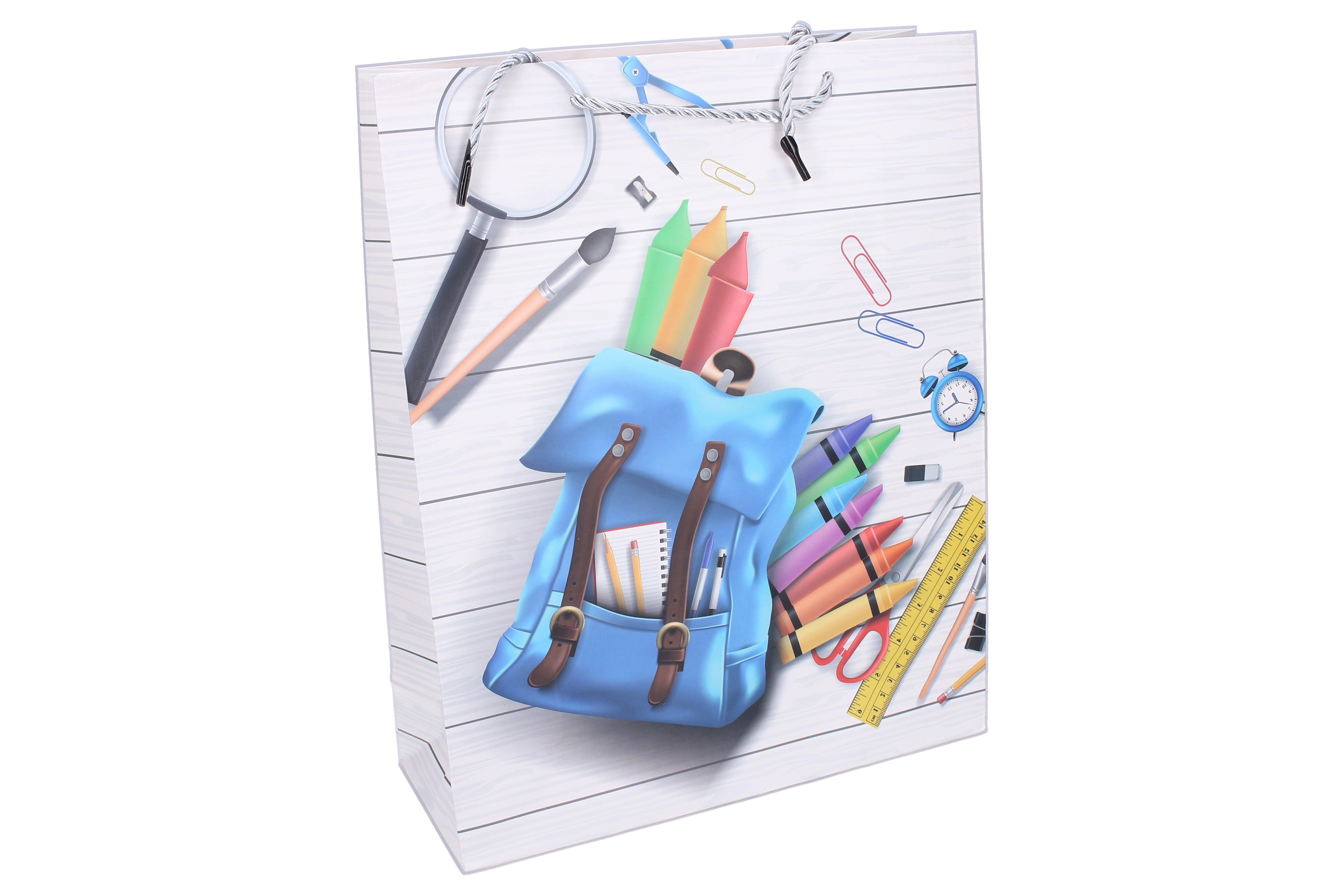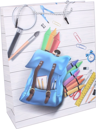 Torba została wykonana z wytrzymałego papieru i ma solidnie zamocowane sznurkowe uchwyty, które zapewniają bezpieczne przenoszenie. Boczki harmonijkowe dodają pojemności i stabilności, dzięki czemu zawartość łatwo wkładać i wyjmować. Dostępne są 4 różne nadruki – zegar, słuchawki i zeszyty, kalkulator z artykułami piśmienniczymi lub miks przyborów szkolnych – dla radosnego i stylowego wręczania prezentów.